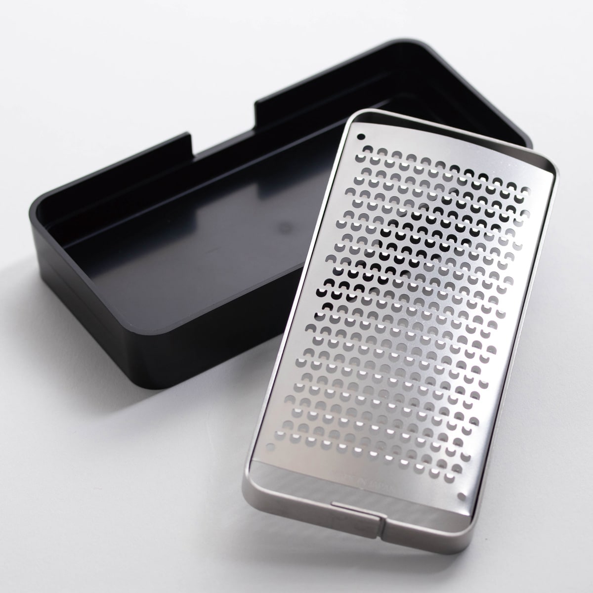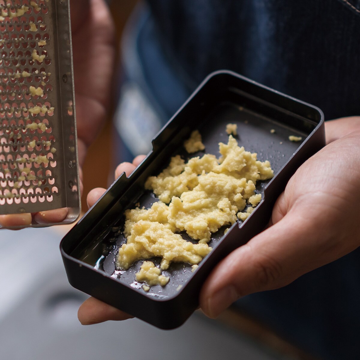 飯田屋が世界中の300種類を超えるおろし金を使い比べてたどり着いた「究極のふわふわおろし金」生姜、にんにく、チーズなど今まで味わったことがない程細かくおろせる!!おろし金も受皿も、金型に至るまで全てが純日本製。とことん日本製を貫きました。少ない力で食材がおろせます!チーズやにんにく等は「撫でるだけ」で食材がおろせます。大きすぎず、小さすぎない今までになかったサイズ。手に馴染みやすい携帯電話のサイズを参考にしました。