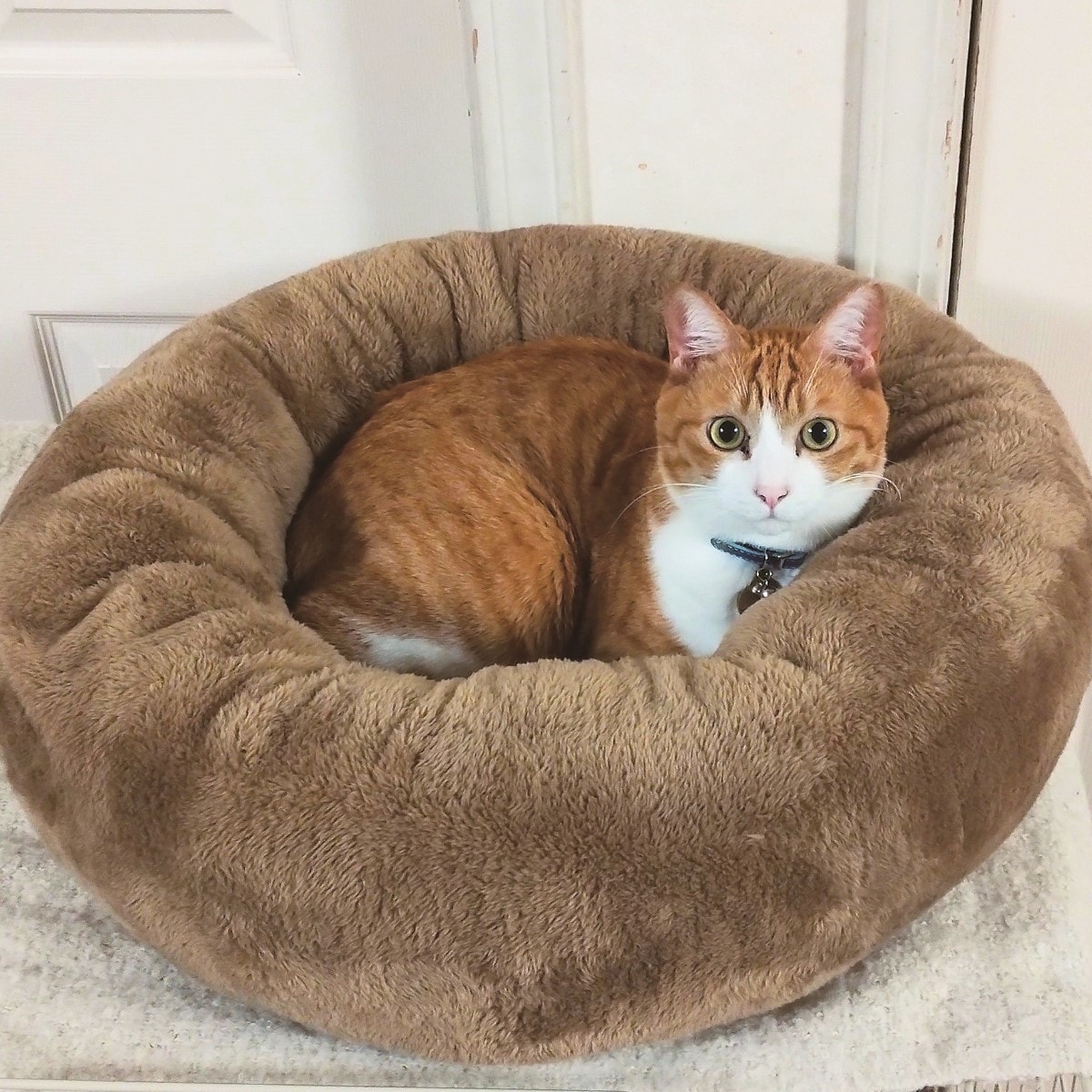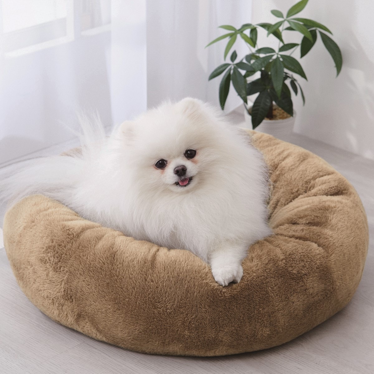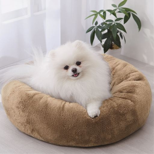 ペットたちが丸まって寝やすい、季節を問わず1年中使える円形型のペット用ベッド。洗濯機で洗えるからいつでも清潔!