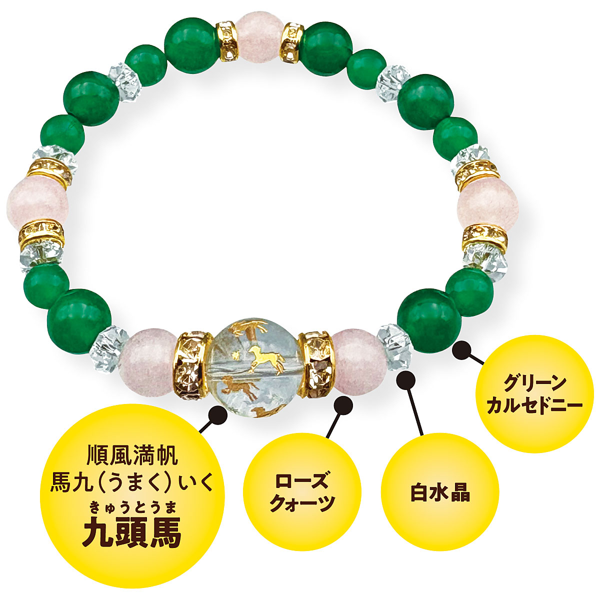 物事すべて上手く行くようにという想いが詰まった開運ブレスレットです。新しいことに挑戦したい、仕事運を高めたい、元気がほしい、気持ちを上向きにしたい方にぴったりです。もちろん午年生まれの方へのプレゼントにもおすすめです♪<九つの御利益>金運招来/商売繁盛/立身出世/勝負必勝/健康長寿/受験合格/縁談成就/家庭円満/豊漁豊作