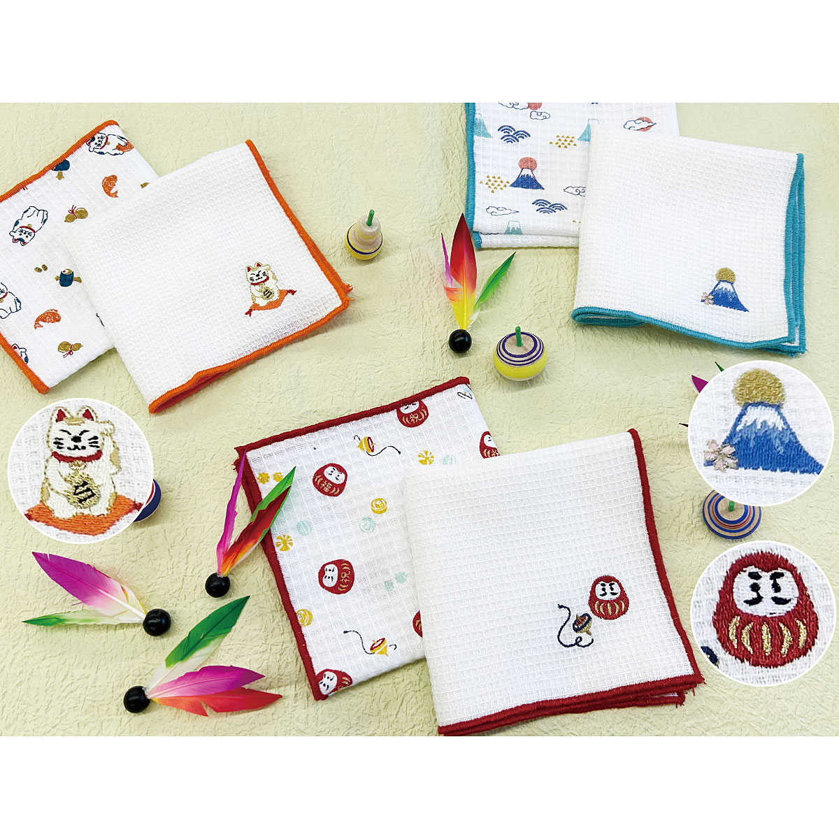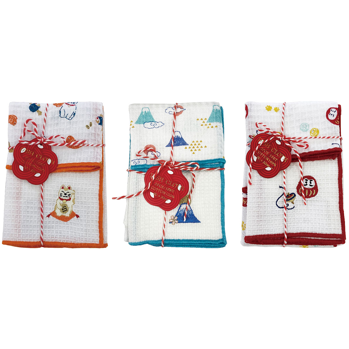 キッチンを華やかにしてくれる可愛いディッシュクロスセットです。縁起の良いモチーフ(招き猫・青富士・だるま)をワンポイント刺繍にしました。総柄プリントとの2枚組×3セット。クロスの内側には「かけひも」がついており、フックなどにもかけやすい仕様になっています。乾きやすくてへたりにくい綿100%のワッフル生地です。年始のご挨拶用などプチギフトにもおすすめです♪