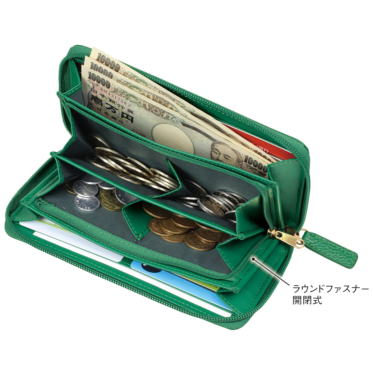 グリーン 小銭が見分けやすい4つのスペース! ラウンドファスナー開閉式