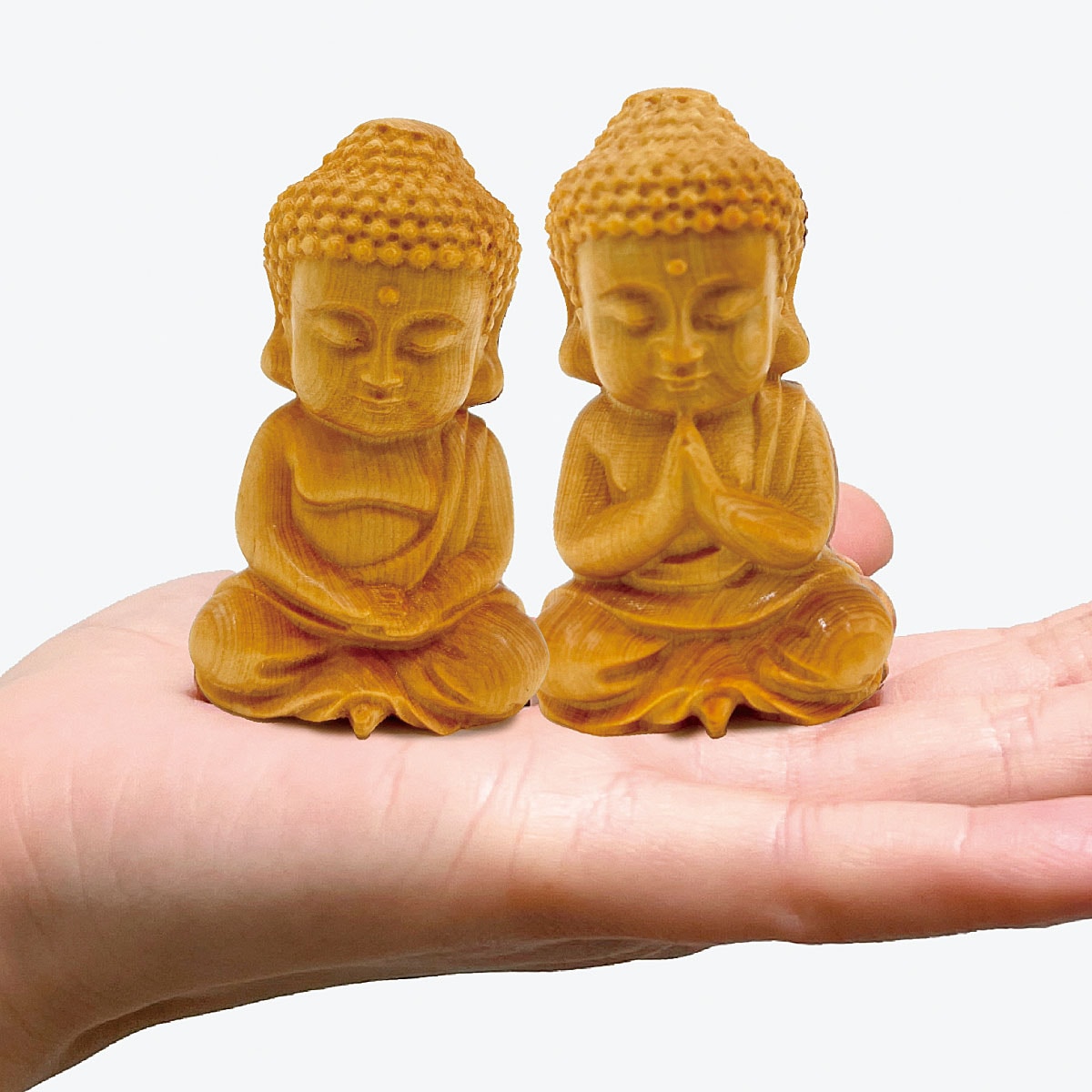 心を平穏へ導く天然木彫りの小さな仏陀さま 左からA(合掌印) B(禅定印)