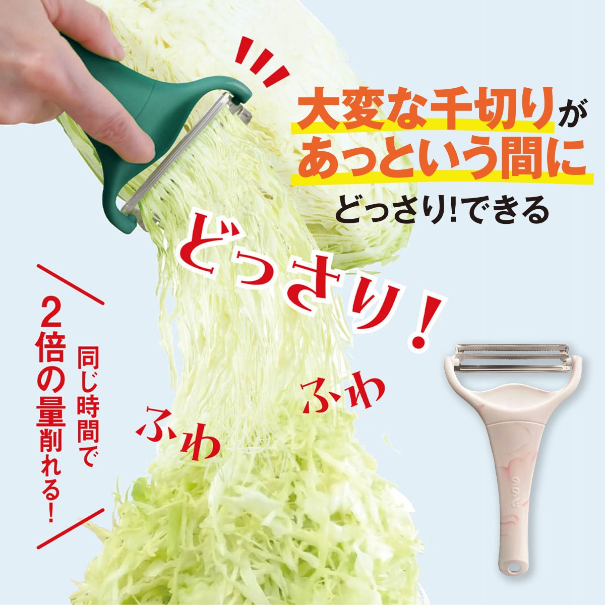 【同じ時間で〈2倍の量〉削れる!】面倒だった千切りキャベツを手早く大量に作れる♪〇新カラー「マーブルストロベリー」登場!!●秘訣はキャベツの千切りを極めた特許取得の「2枚刃」まるでお店のようなふわふわでシャキシャキな千切りキャベツが簡単につくれます。調味料の味が染みこみやすくなるのも特長です。●まな板も包丁も不要だから洗い物が減るのもうれしい♪●キャベツの千切り以外に玉ねぎや大根などの薄切りにも!