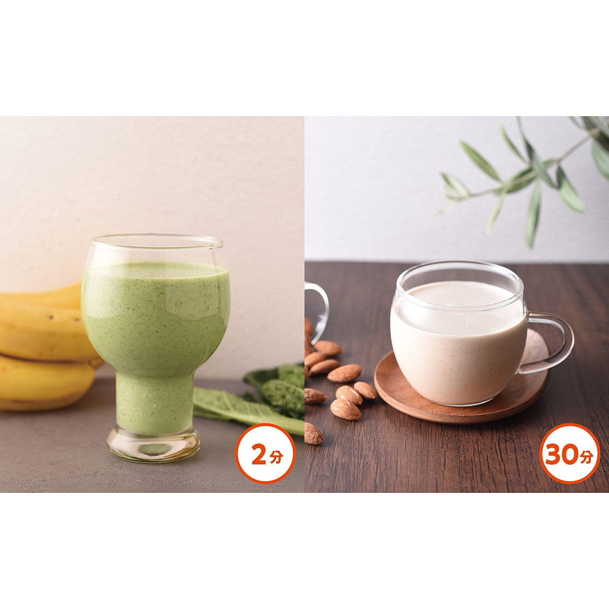 2分 野菜不足にスムージー! 30分 アーモンドも細かく砕いてアーモンドミルク