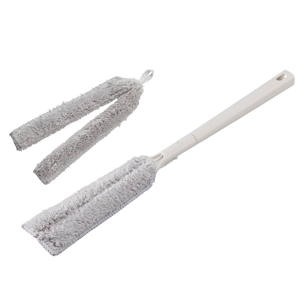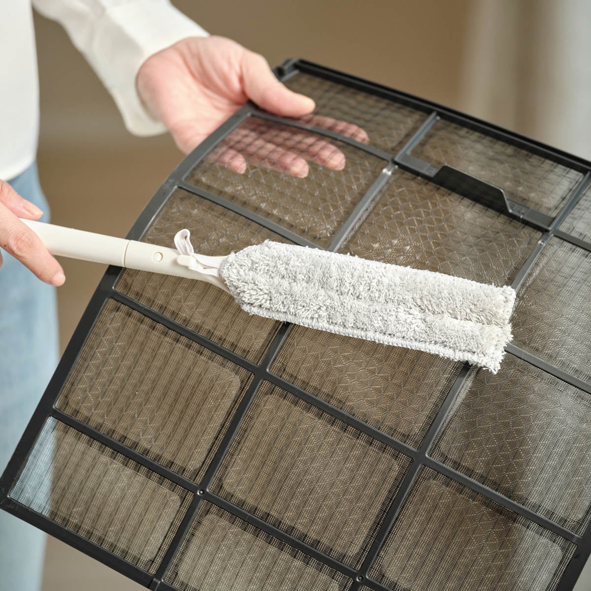 エアコンの送風口の狭いすき間を掃除できるハンディモップ。全長約37cmの長い柄でラクラク届く!!ヘッドは薄型の二股形状でガッチリ挟めます!モップは洗って繰り返し使うことができて経済的◎