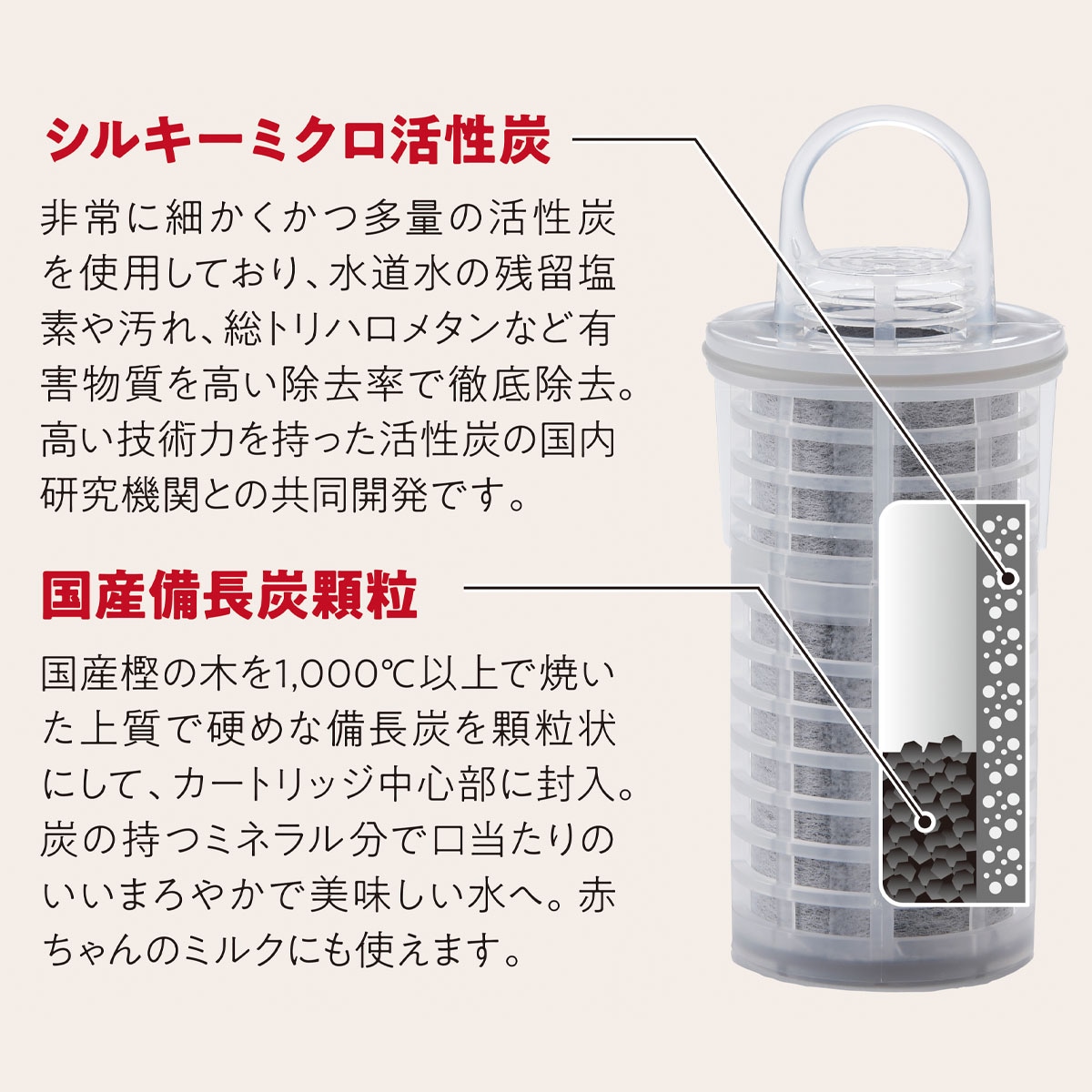 ■材質/[本体]ABS樹脂、AS樹脂他 ■ろ材の種類/活性炭、不織布、ケイ酸チタン ■機能性ろ材/国産備長炭(樫) ■サイズ(約cm)/本体:幅18×奥行8.5×高さ24 カートリッジ:直径5.5×高さ13 ■重量(約g)/本体:502 カートリッジ:54 ■ろ過水容量/約1.2L●日本製【保証書付1年間】