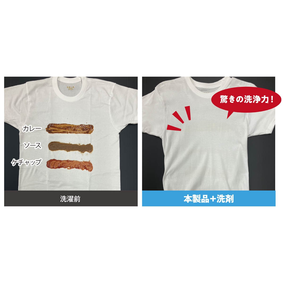衣類の汚れ落ちの実証 3種類の汚れ(カレー・ソース・ケチャップ)をTシャツに付着させ、洗濯機で洗濯。繊維の奥までしみ込んだ汚れも1度の洗濯で目立たない状態に!