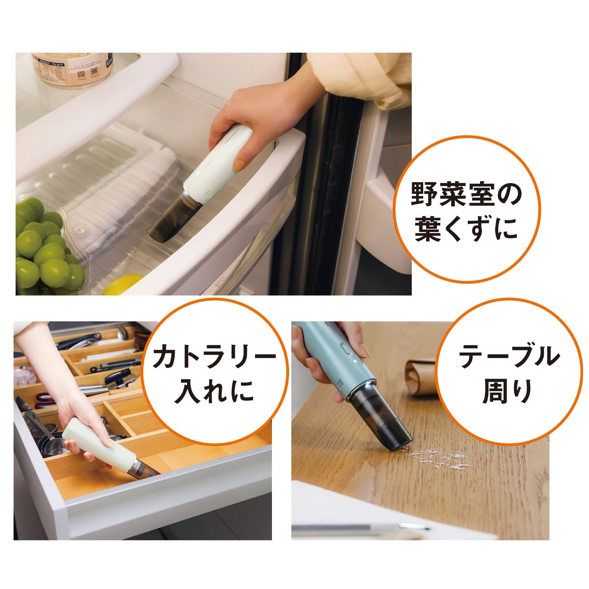 わずか3.5cm幅のコンパクトクリーナー。床と同じ掃除機で食べ物を扱うところを掃除するのはちょっと…という方におすすめです。拭き掃除で除去しきれない粉末や野菜室の隅などに。