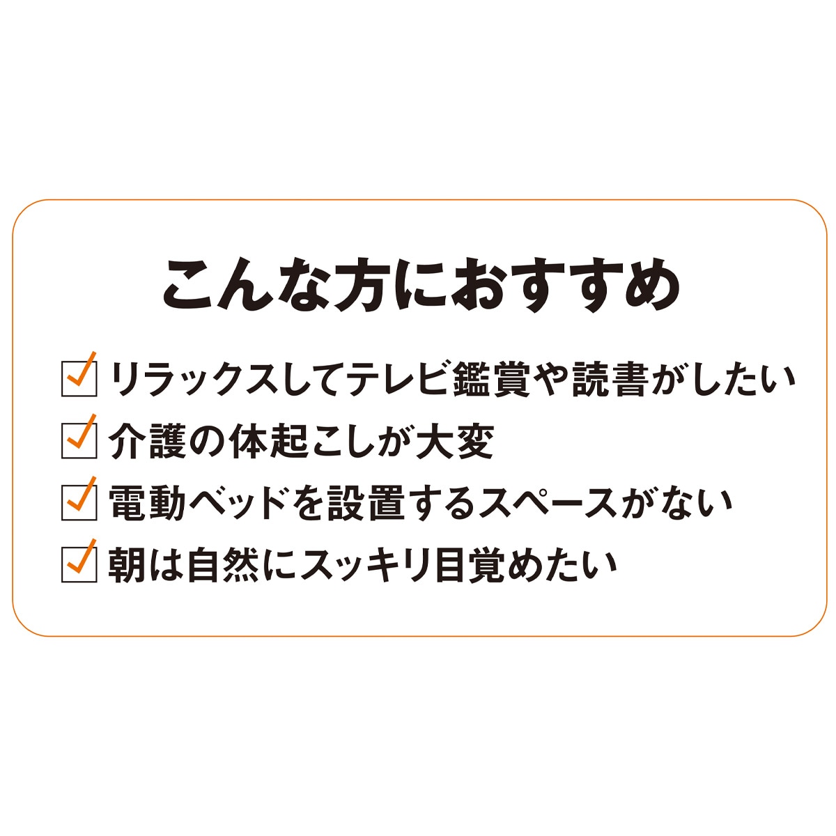 水平な状態から約60秒で起き上がる!家中どこでも使える充電式のコードレス。充電式なのでコンセントを気にせず設置でき、移動にも便利。上げる、下げるをボタン一つで操作ができ手複雑な設定は不要。操作部は本体と一体化しているのでリモコンを探す煩わしさがありません。