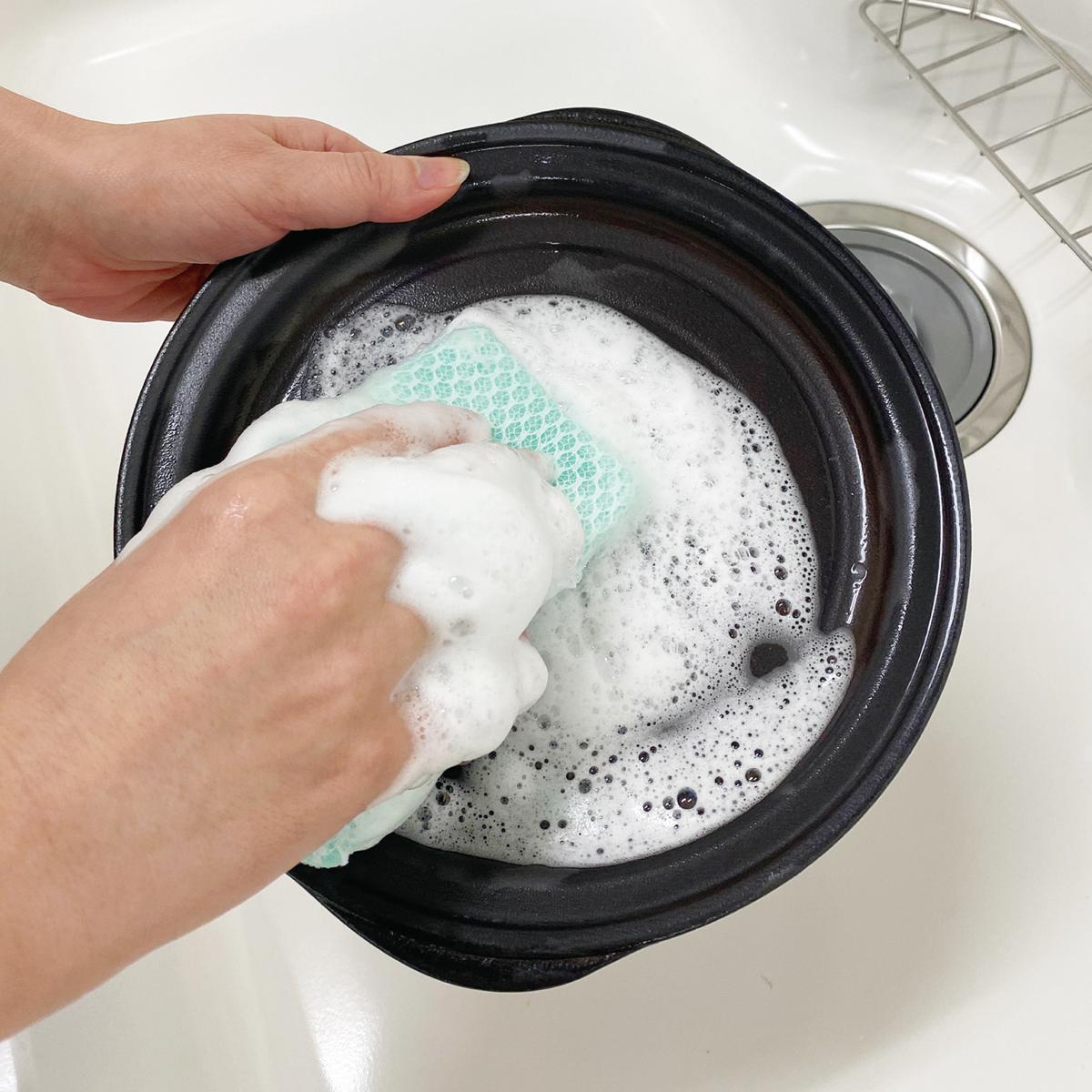 洗い物もこれ1つでOK! コーティングしていないので、金属たわしやブラシも使えます。