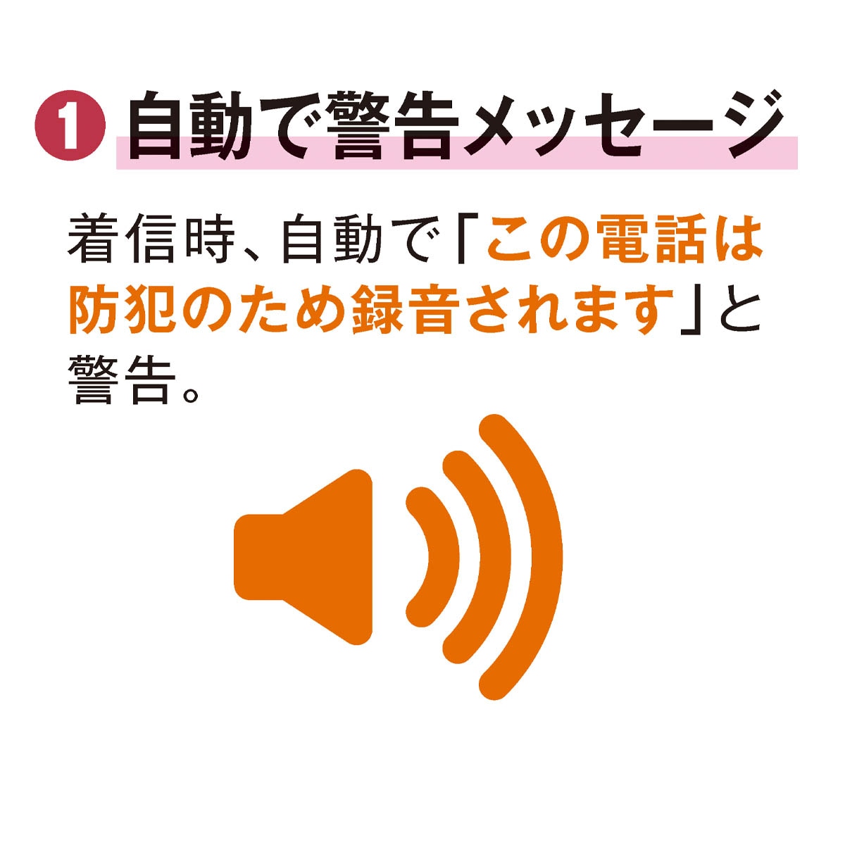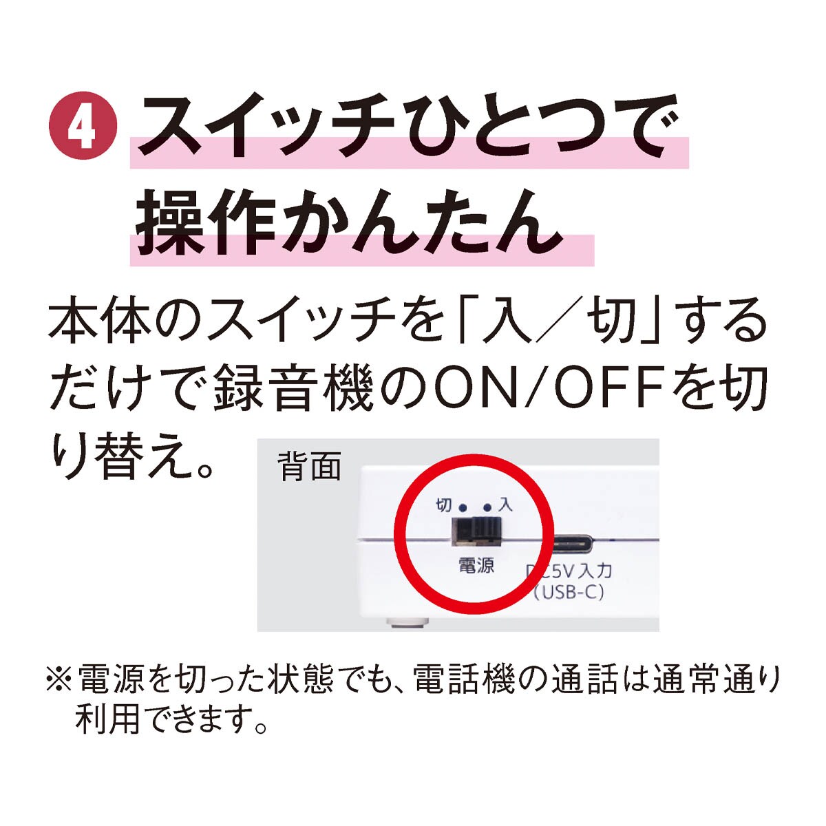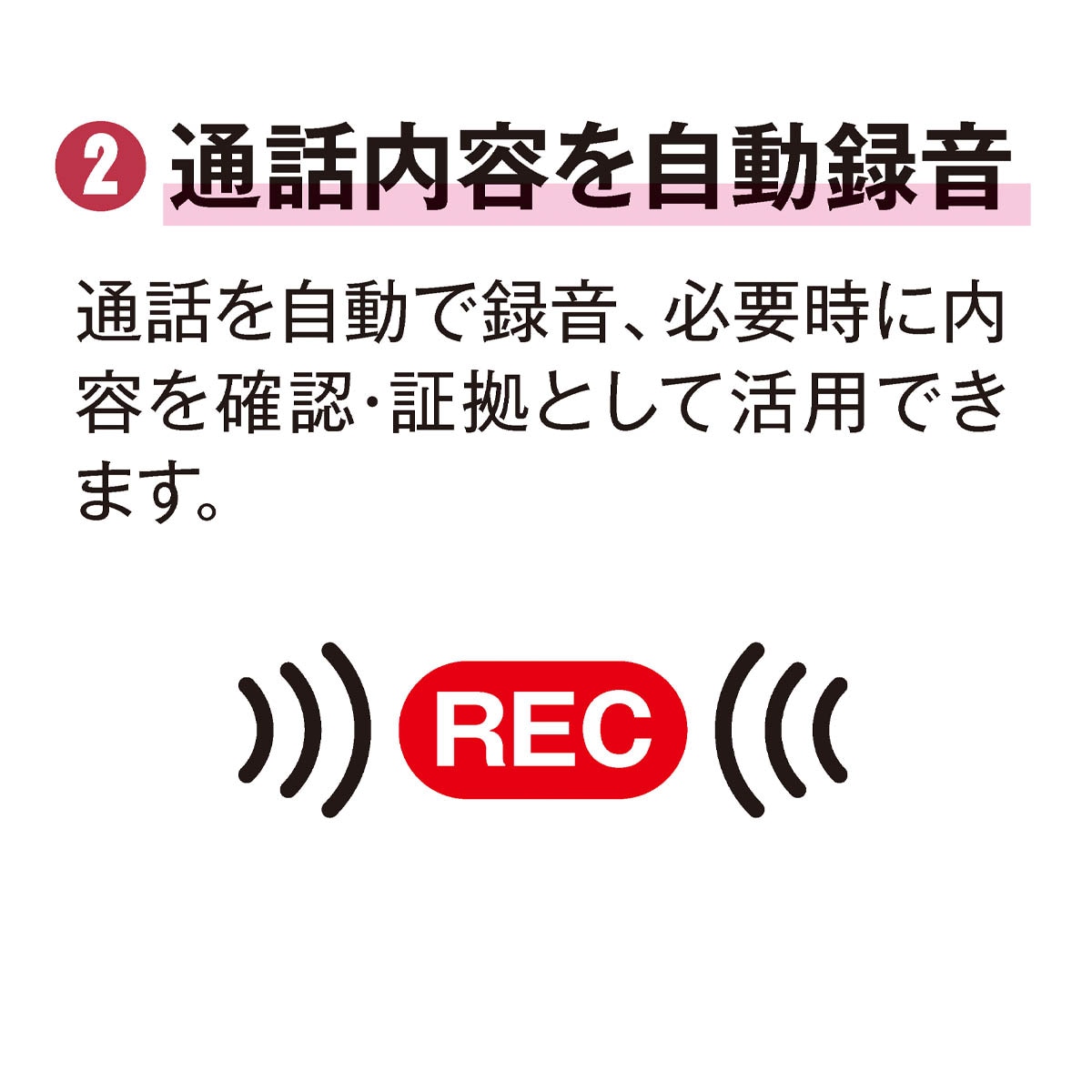 1:自動で警告メッセージ着信時、自動で「この電話は防犯のため録音されます」と警告2:通話内容を自動録音通話を自動で録音、必要時に内容を確認・証拠として活用できます。3:かんたん取り付け・そのまま使えるいま使用の電話機に付属のコードをつなぐだけ。電話機の買い替え・工事は不要ですぐに利用できます。4:スイッチひとつで操作かんたん本体のスイッチを「入/切」するだけで録音機のON/OFFを切り替え。※電源を切った状態でも、電話機の通話は通常通り利用できます。