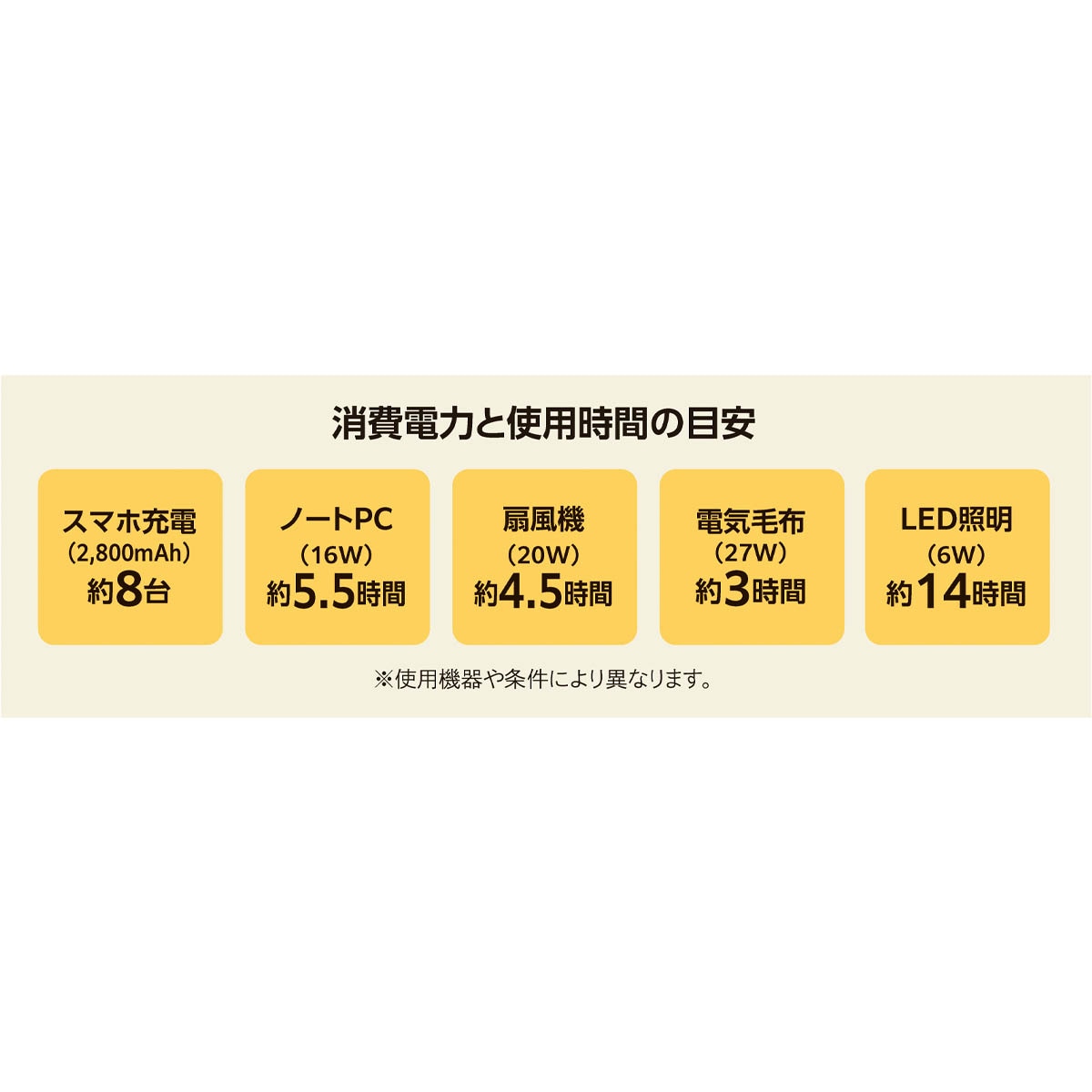「リン酸リチウムイオンバッテリー」は充電時に熱を発生しにくいので安心。さらに繰り返し充電に強く長寿命な次世代電池です。28,000mAhの大容量に多数の接続ポートを備え、様々な機器に給電可能。LEDライトやラジオを搭載し災害時にも頼もしいポータブル電源です。