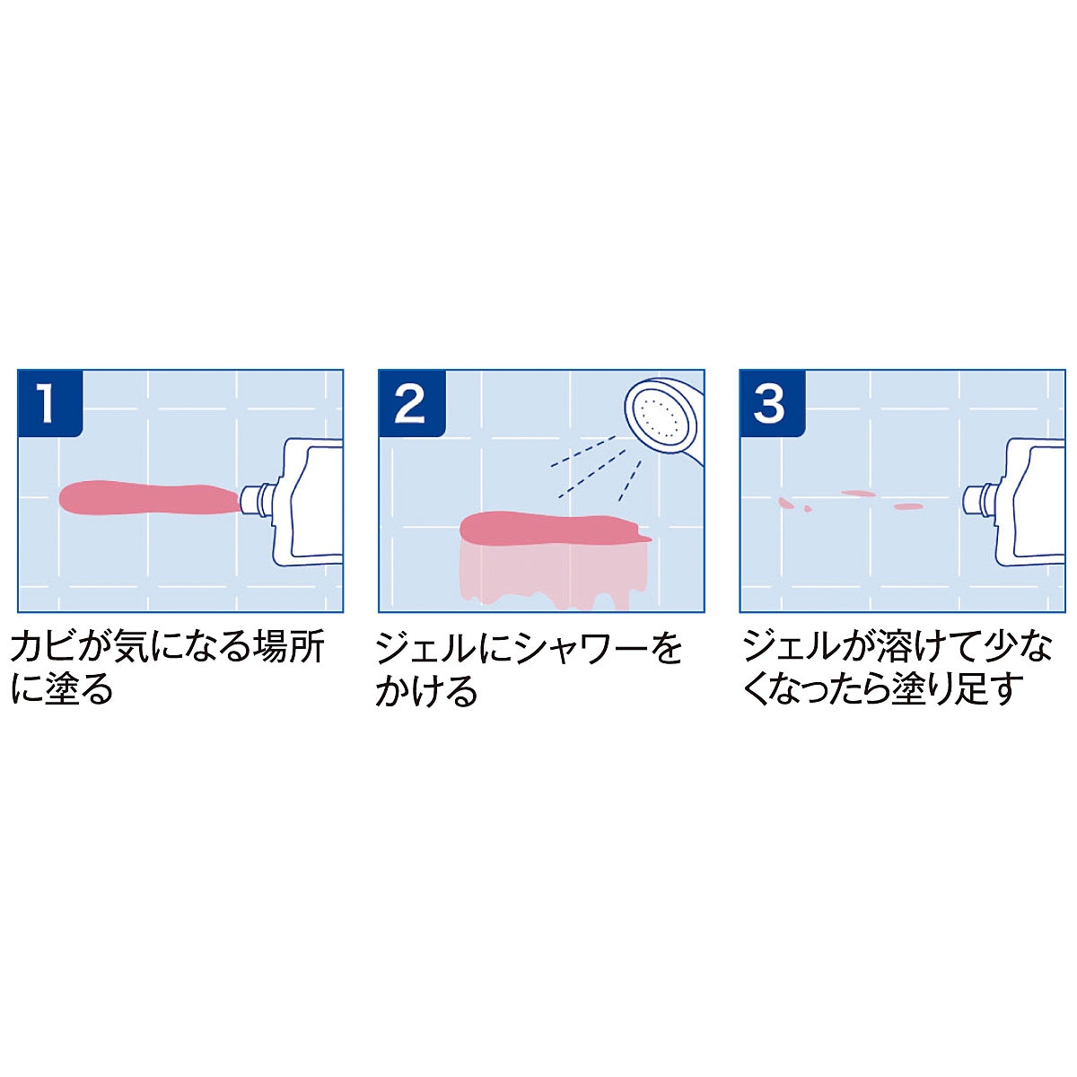 1 カビが気になる場所に塗る 2 ジェルにシャワーをかける 3 ジェルが溶けて少なくなったら塗り足す