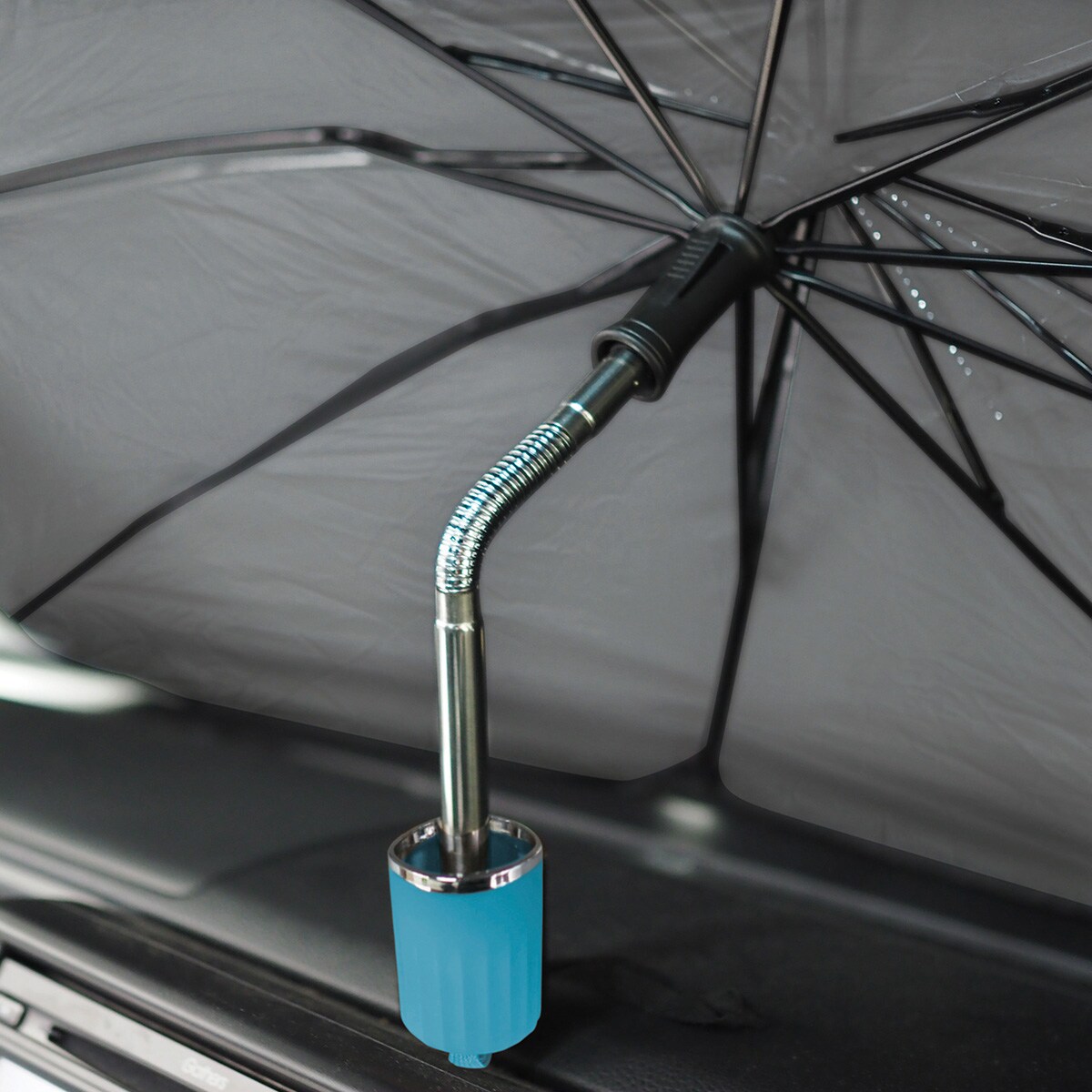 折りたたみ傘のようにサッと広げたらフロントガラスにセット。車内を直射日光から守ります。駐車場で探すときの目印にも。