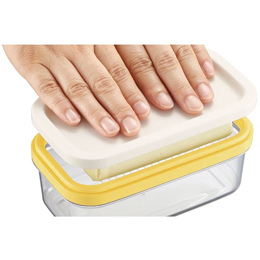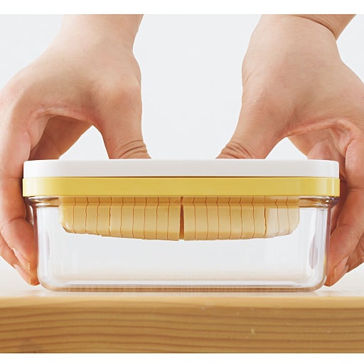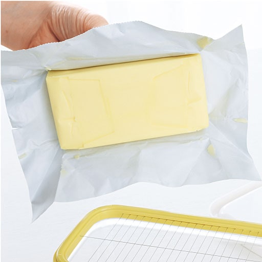 バターをギュッと一押し!ナイフも手も汚さずに、約5グラム(※)の薄切りにカットします。ケースごと冷蔵庫にそのまま保存OK!