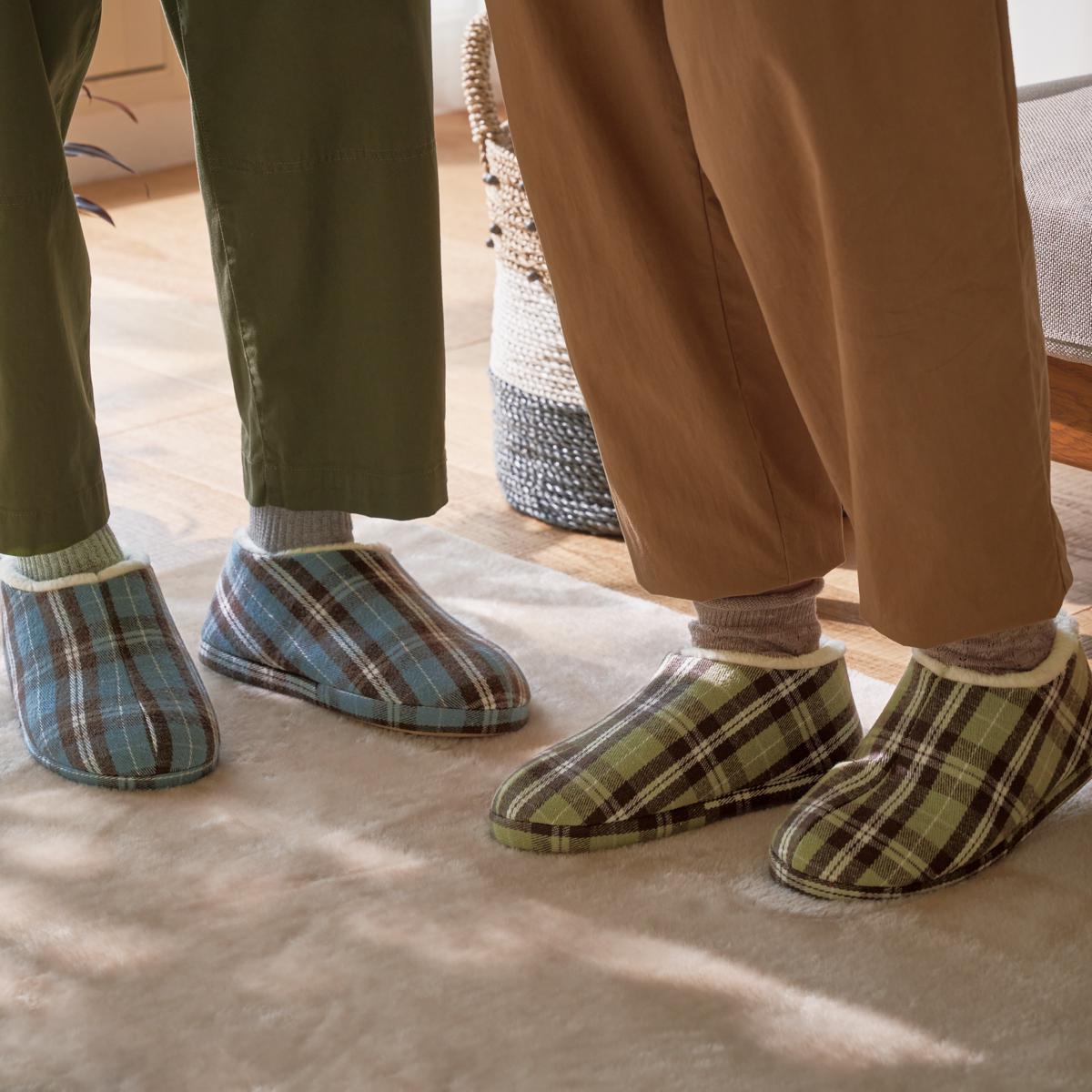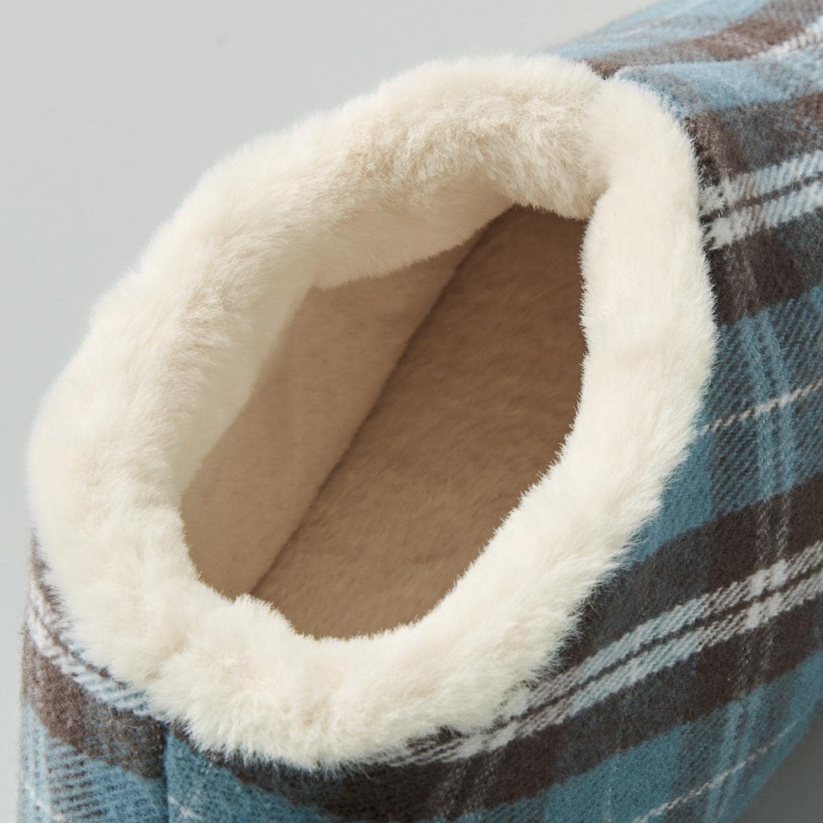 表面はやさしい色合いの可愛いチェック柄。内側は全面なめらかなラビットファー調のフワモコ素材でぬくぬく。ずっと触れていたくなるような心地よさです。裏面はすべりにくい加工を施しています。