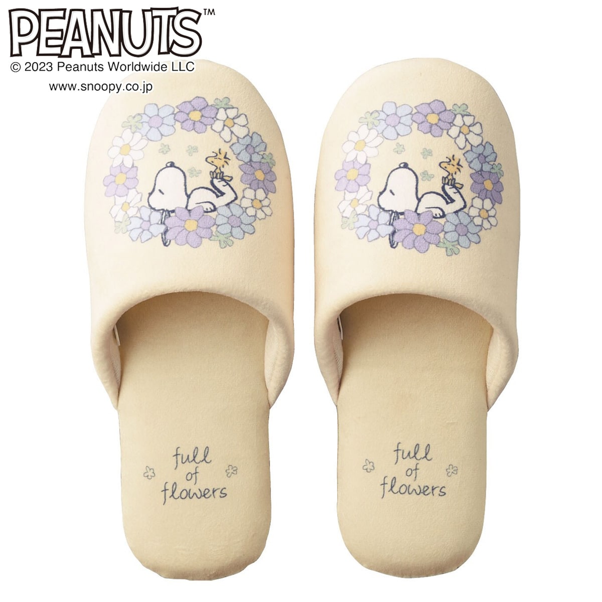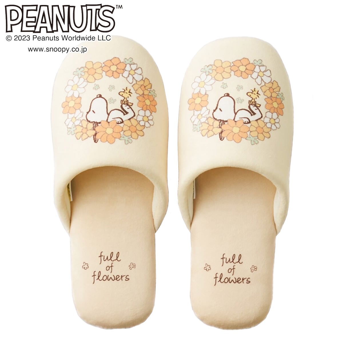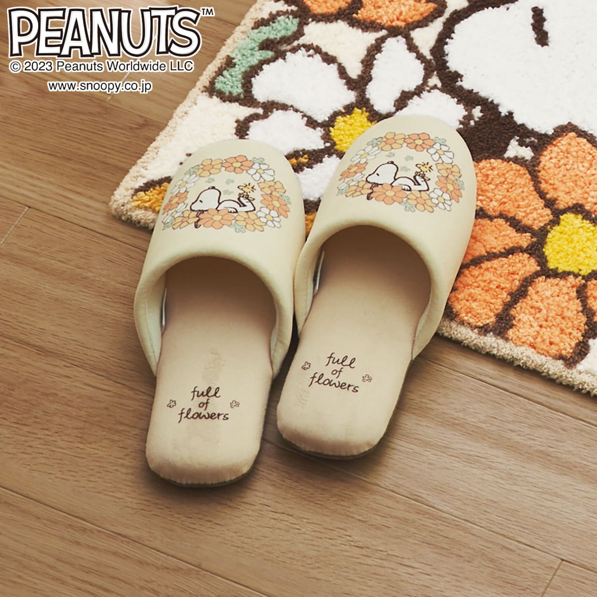 オレンジ花いっぱいのキュートな柄にときめく、スヌーピーのスリッパです。