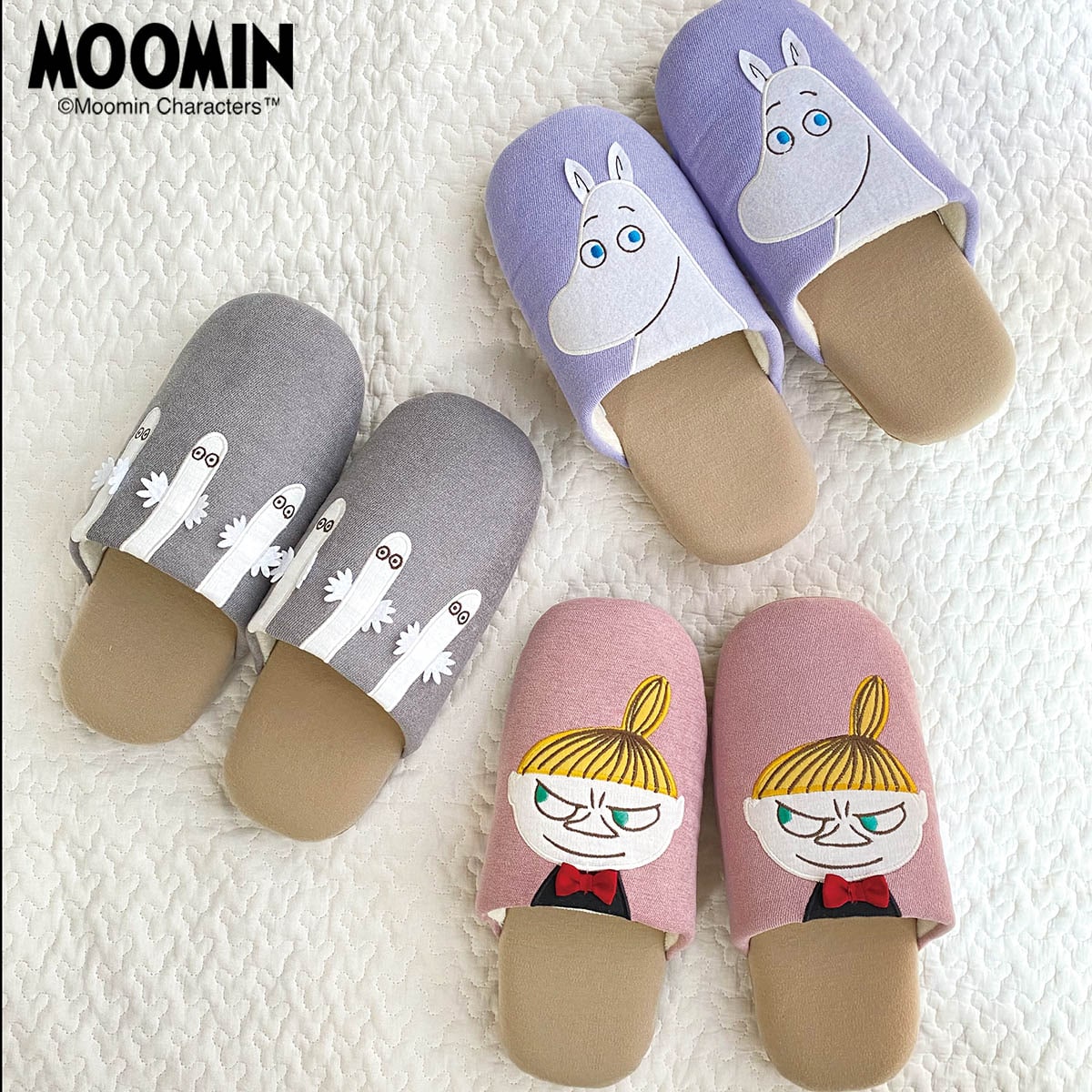 ムーミンと仲間たちの立体的なアップリケがとってもキュート! オールシーズン使える、ふんわりニット生地のソフトワイドスリッパです。
