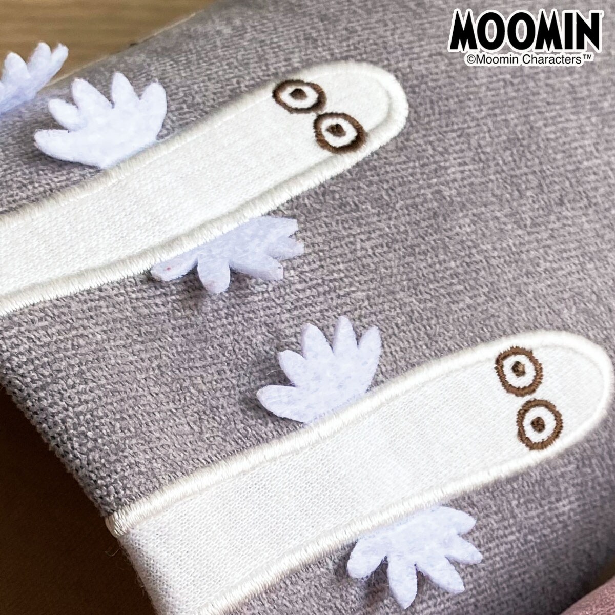 (上から) パープル(ムーミン)・ピンク(リトルミイ)・グレー(ニョロニョロ)ムーミンと仲間たちの立体的なアップリケがとってもキュート!