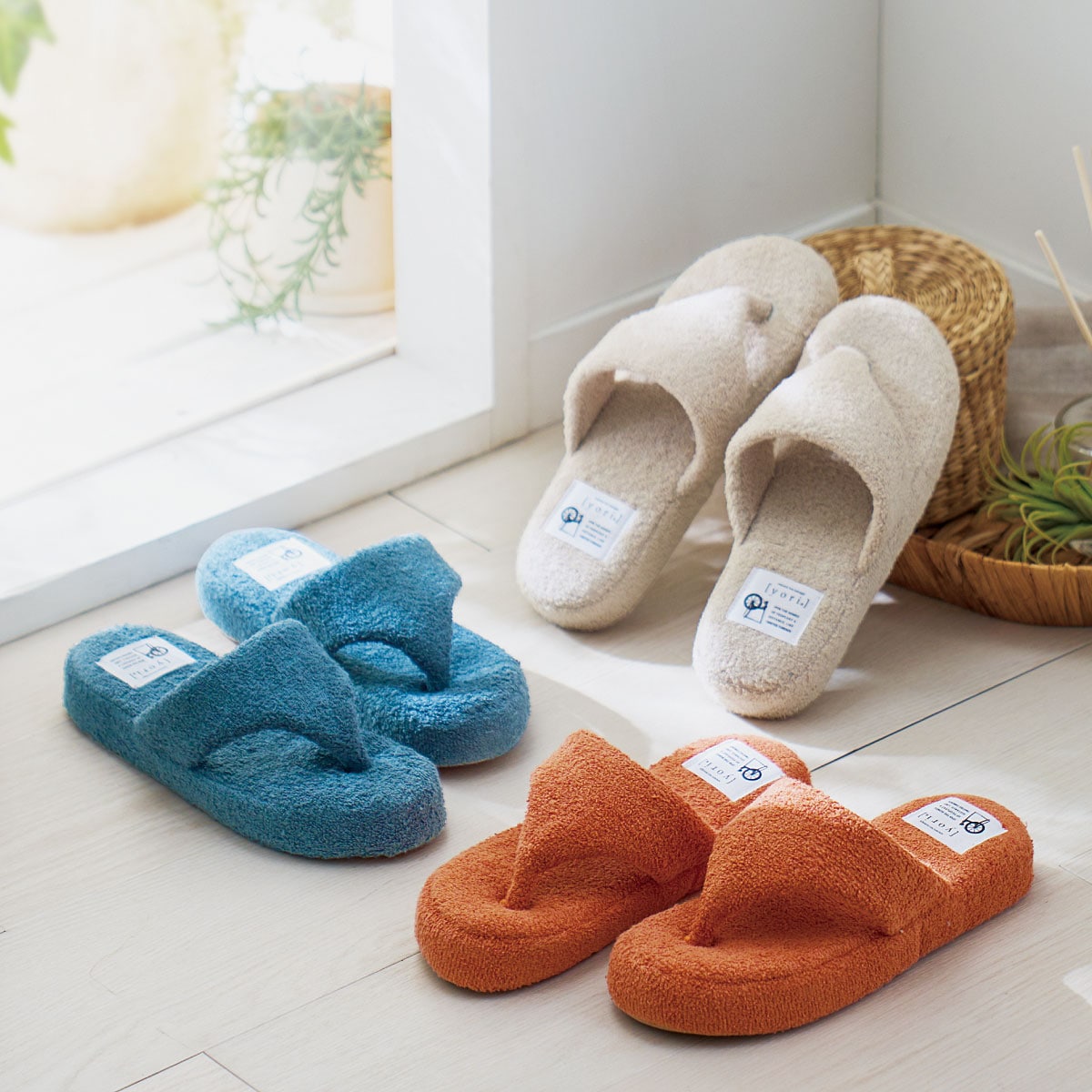 (左から) ブルー・ベージュ・オレンジ素足が喜ぶやさしい肌ざわりで、ふんわりとした履き心地のタオル鼻緒スリッパです。