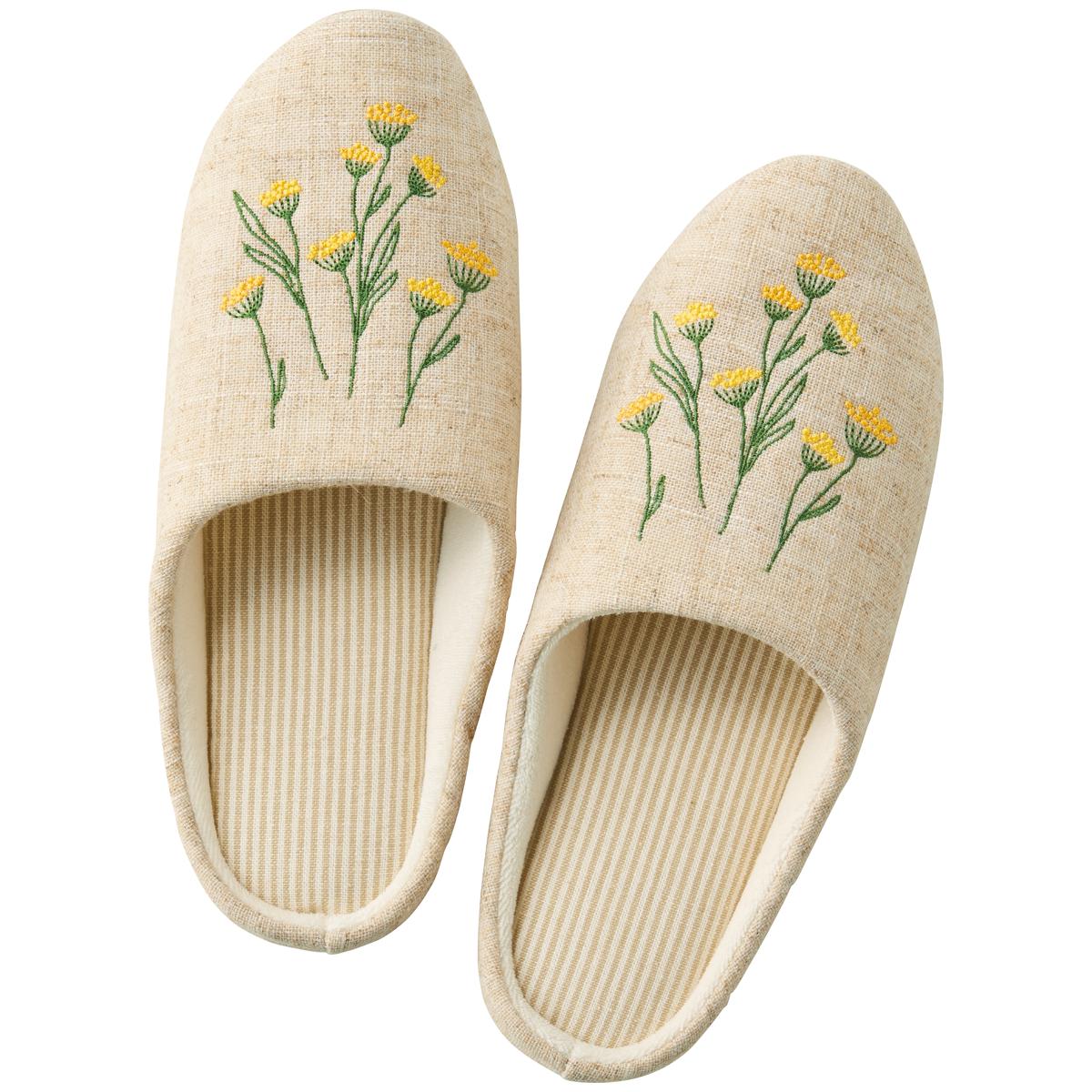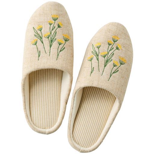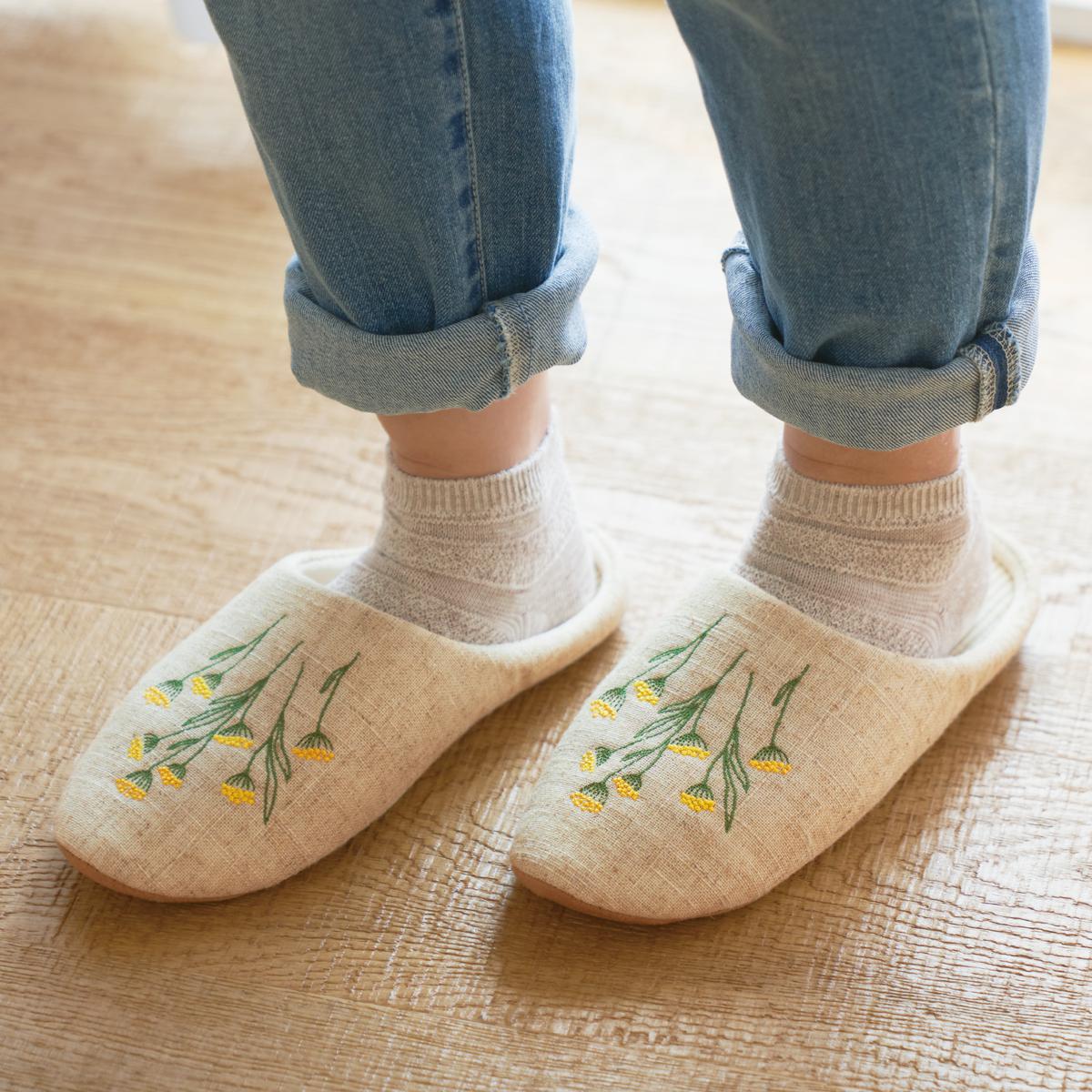 軽やかな履き心地で気分爽やか!自然素材の風合いと繊細な刺しゅうが調和した、温かみのあるおしゃれなスリッパです。