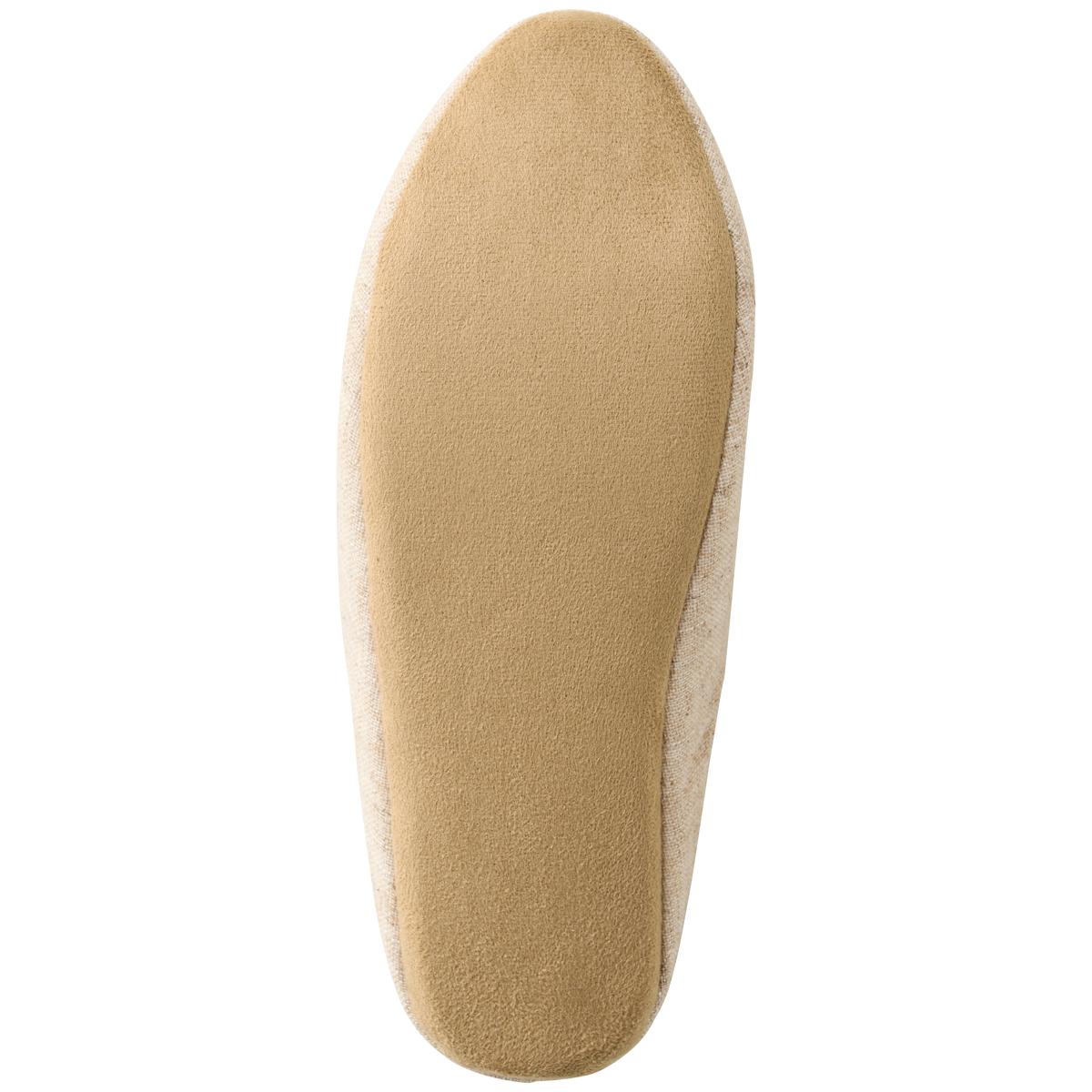 ナチュラルな麻混素材に刺繍が映えて、春夏にぴったり。中敷きはさらっとした肌ざわりの綿混素材、甲裏は足当たりの優しいパイル素材です。底面はパタパタ音がしにくいポリエステルスエード生地。