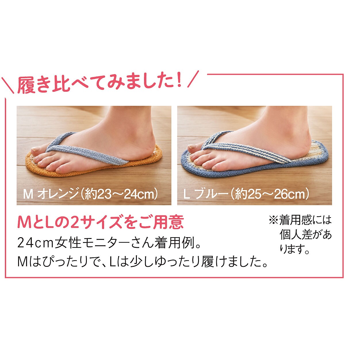 足サイズ約24cmの女性モニターさんがM・Lサイズを履き比べてみました! Mサイズはぴったりで、Lサイズは少しゆったり履けました。 ※着用感には個人差があります。