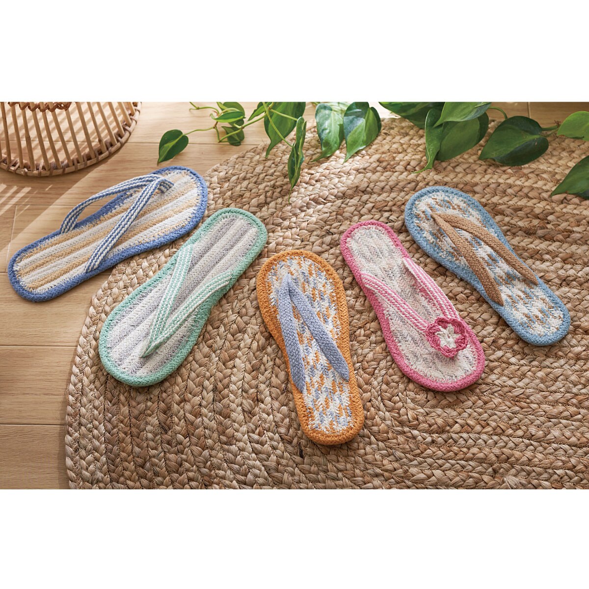 (上から時計回りに) ブルーL・ピンク花M・ミントグリーンL・ライトブルーM・オレンジM1足ずつ手仕事で丁寧に編み上げています。
