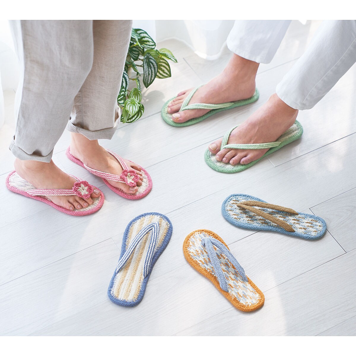 (奥から) ブルーL・ピンク花M・ライトブルーM・オレンジM・ミントグリーンLスリッパは汗で蒸れるからイヤという人におすすめ。