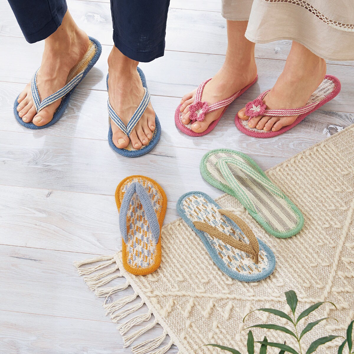 (上から時計回りに) ミントグリーンL・ライトブルーM・オレンジM・ブルーL・ピンク花M洗うほど素足になじんで、心地いいフィット感。