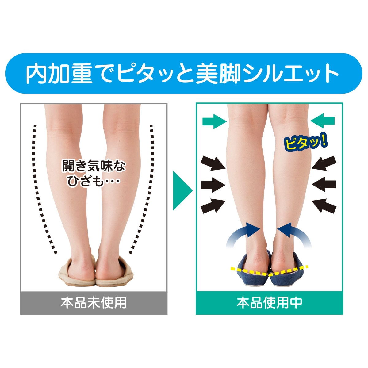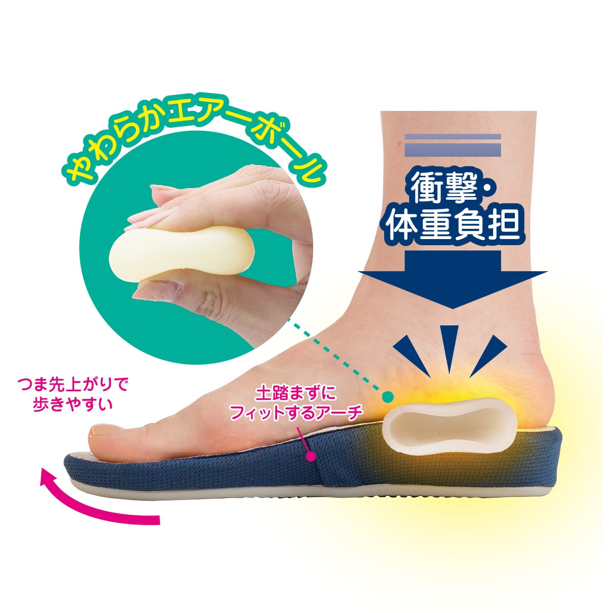 エアーボールのクッションでひざ・足首・かかとへの体重負担を軽減。内加重で美脚シルエット!
