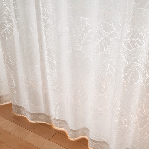 【ネット限定】大胆なリーフ柄がお部屋のアクセントに。目隠し効果・UVカット機能付きのレースカーテンです。気になる昼間の外からの視線をガードします。