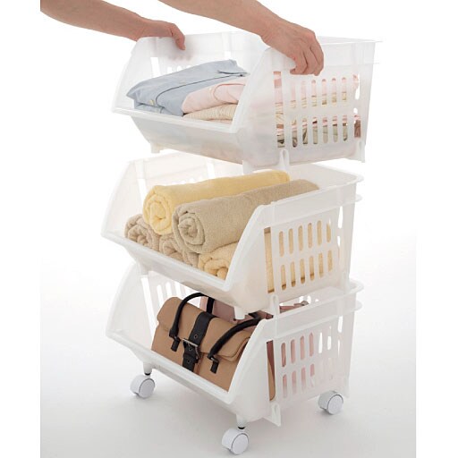 積み重ねても取り出しやすい!サッと出し入れできるバスケット型。クローゼットやワードローブに収まりきらない洋服の収納場所に。開口部の大きいデザインで、ランドリー・サニタリーでタオルや洗剤などの収納にもピッタリ。