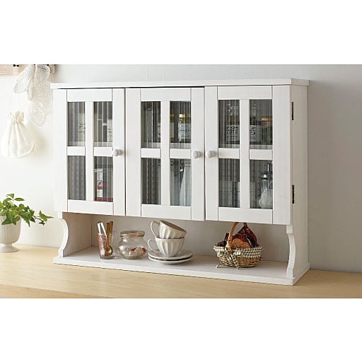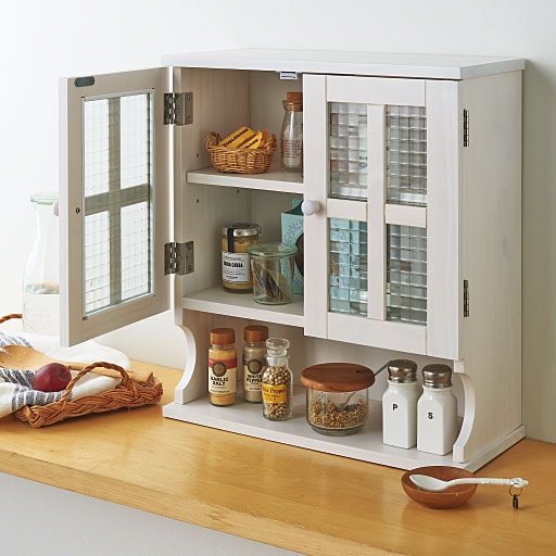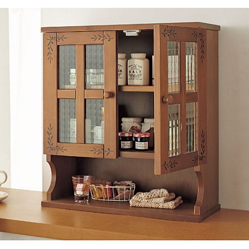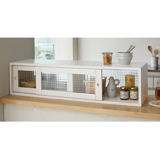 お茶やパン、お菓子など物であふれがちなカウンターをナチュラルに演出しながらお片付け。対面タイプは前後に引き戸があり、キッチン側からもリビング側からも出し入れできます。ブラウンはオリーブ柄がアクセント。2色4タイプからお選びいただけます。