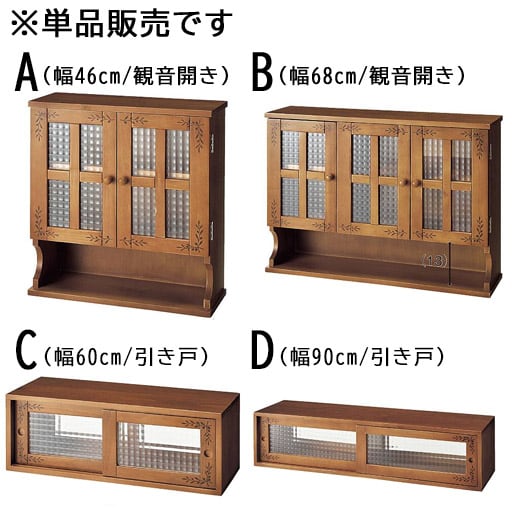 ■[本体]天然木パイン材(ラッカー塗装)[扉]5mm厚格子ガラス ■サイズ(cm)/[扉内内寸(A・B)]幅A:41 B(小)20(大)42×奥行16×高さ30 幅(扉内内寸)C:57 D:43/(間口内寸)C:26 D:41×奥行18×高さ19 [オープン部内寸(A・B)]幅A:41 B:64×奥行18×高さ13 ■棚板/可動式A:1枚 B:小大各1枚(3cmピッチ3段階) ■重量(kg)/A:6 B:8.5 C:6.5 D:8▼研磨跡が光の当たり具合によって傷に見えるものや、木の節や継ぎ目が見えやすくなる部分がございます●中国製【完成品】 【小型別配送】 ※沖縄県や一部島しょ部など配送上の都合によりお届けできない地域がございます。