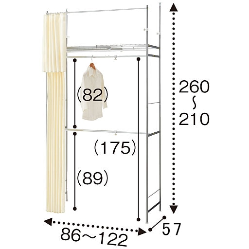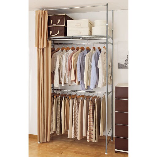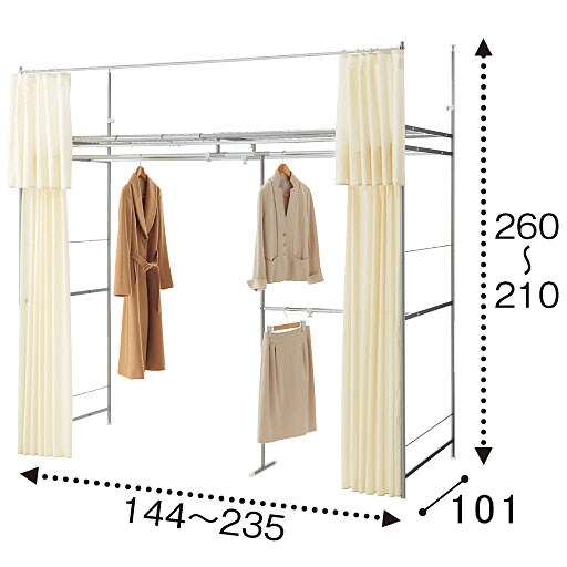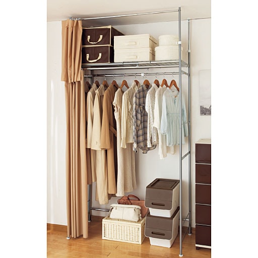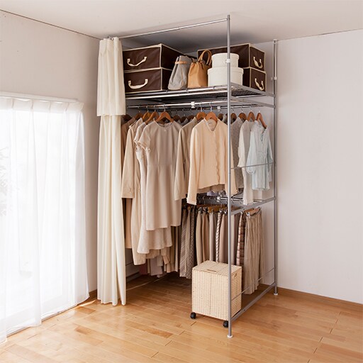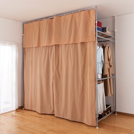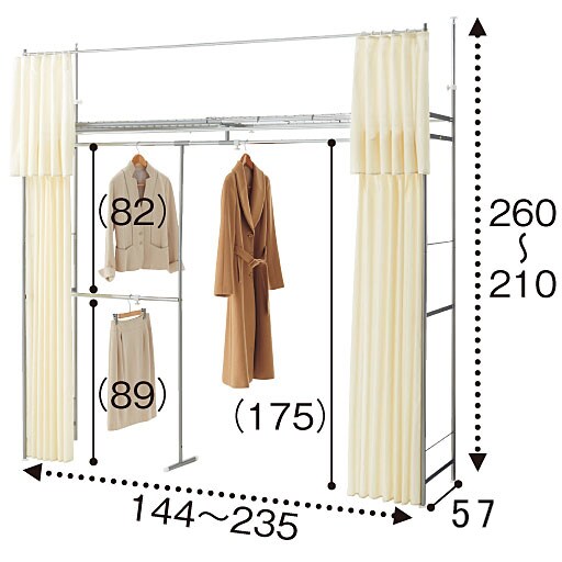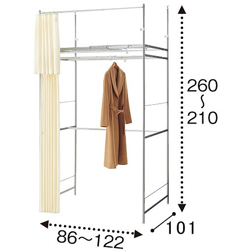 ■[本体]スチール(粉体塗装・クロムメッキ) [カーテン]ポリエステル65%・綿35% ■耐荷重(kg)/[ハンガーバー]24(1本あたり) [棚板]20 ■重量(kg)/A:16 B:19 C:25 D:27 ●カーテン付き ■A~Cは1個口、Dは2個口でお届け●日本製【大型別配送】 【組立式(2人で)90分程度】 ※沖縄県や一部島しょ部など配送上の都合によりお届けできない地域がございます。