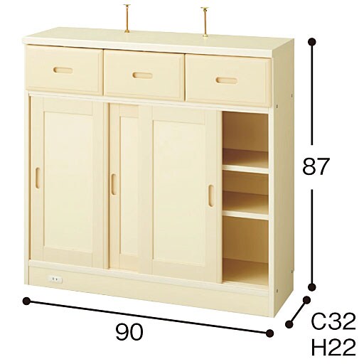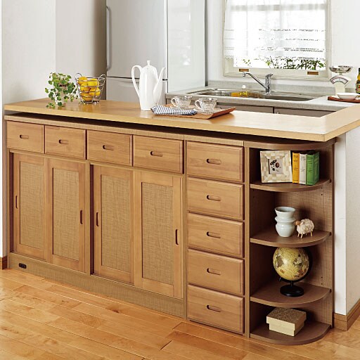 【お客様組立】出し入れに場所をとらない引き戸扉のカウンター下収納。食器や調理器、リビング用品と何でもおまかせのキャビネット。窓下収納としてもおすすめです。カウンターの奥行に合わせて薄型タイプもご用意しました。
