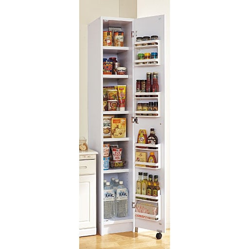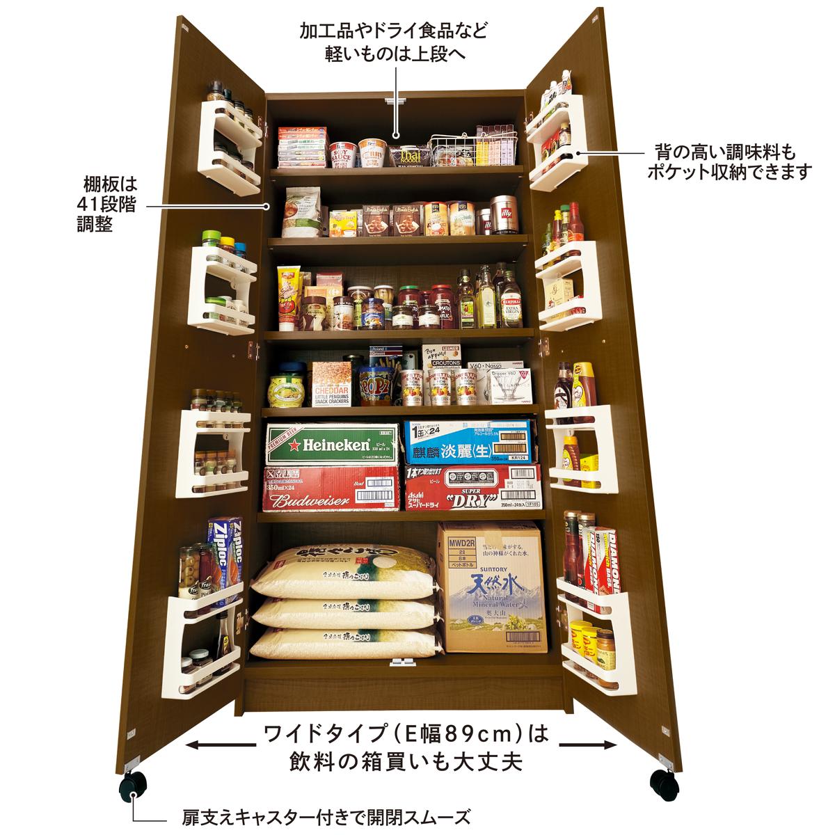 棚板は耐荷重50kg!調味料やレトルト食品だけでなくお米やビールケース、2リットルのケースなど重たい物だってこれ一台でしっかり収まる!仕切りがない大容量仕様。扉の裏面にもポケット収納が付いていて背の高い調味料も収まります。扉を支えるキャスターが付いているのでたくさん収納しても開閉スムーズです。狭いすき間にピッタリの幅30cmから大容量幅89cmまで5サイズ展開。お部屋の床やスペースにあわせてお選びください。