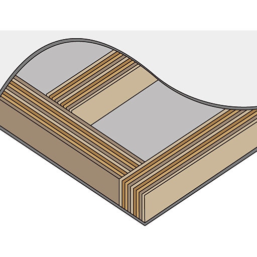 薄くスライスした天然木をタテに重ねて接着することで強さを増した積層合板(LVL)を芯材に使用。