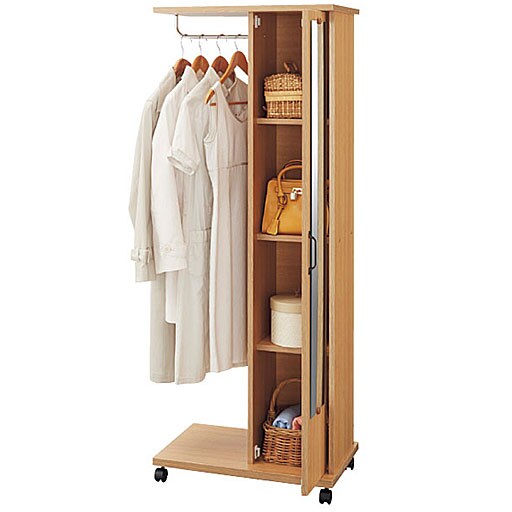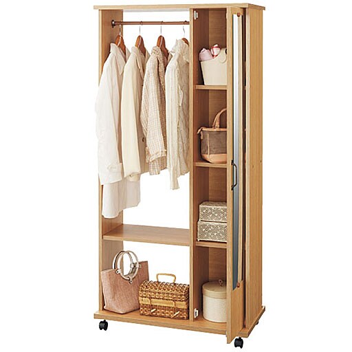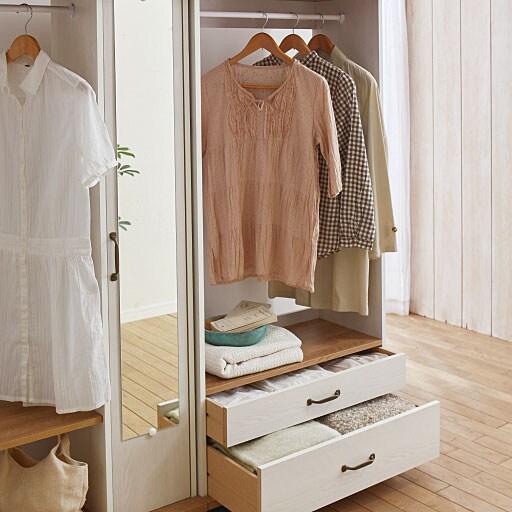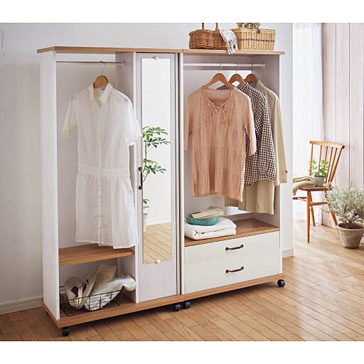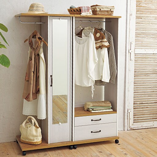 全身チェックができるミラー付きと細々としたものを収納するのに便利な引き出し付きハンガーラック。キャスターが付いているので移動もラクラクです。ミラー扉の中には棚板が3枚付いていてバッグなどの収納に便利。毎日の洋服の収納に、2段の引き出し付きラックとダブル使いでどうぞ。