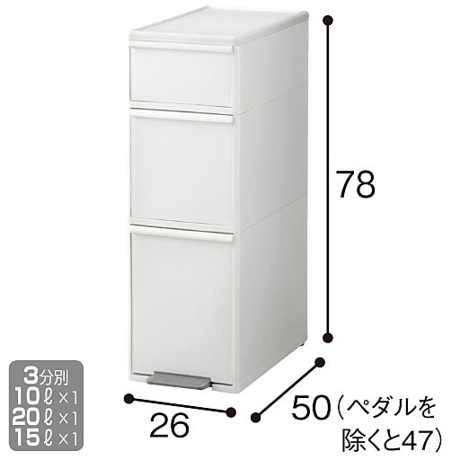 スリムタイプの多分別ダストボックス。最下段はペダル式なので、ゴミ箱に直に触れずにポイ!引き出しは取り外して丸洗いできるので清潔な状態をキープすることができます。10リットルの浅引き出しはゴミ袋の収納にも便利。