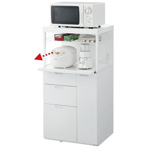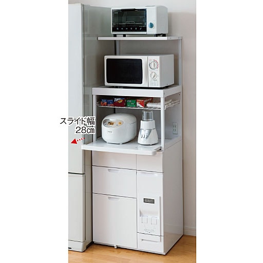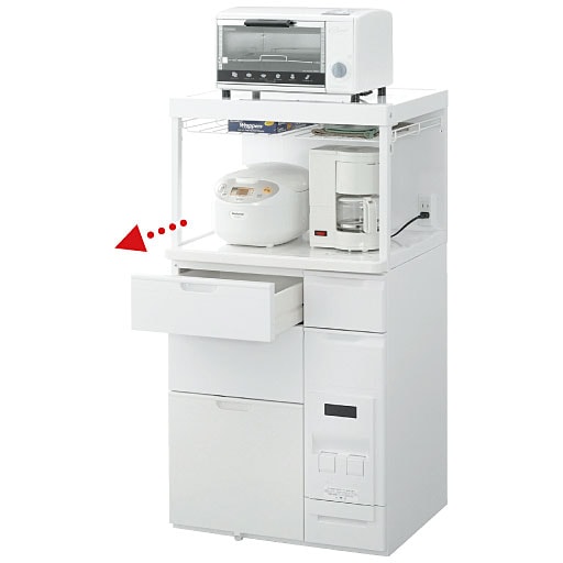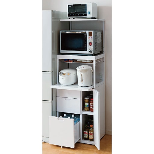 重い物も取り出しやすい引き出しタイプ。家電とストック食品をひとまとめにできます。調理器具と食品ストックをひとまとめにできるレンジ台。意外と収納場所に困るお米もすっきり整理できる米びつタイプもご用意。