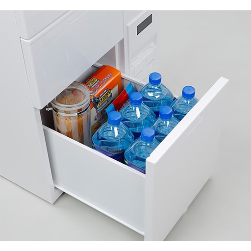 左下の引き出しには、ペットボトルもしっかり収まります。