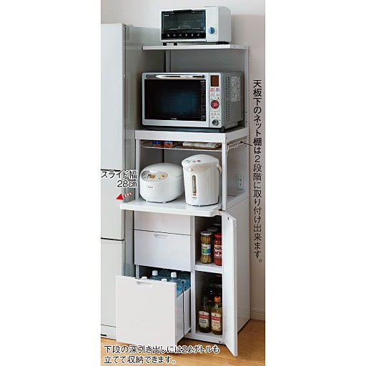 大型レンジも収納出来るSGマーク付きの家電ラック。下段の深引き出しには2リットルのペットボトルが立てて収納できます。ラップやホイルなども収納出来る天板下のネット棚はレンジのサイズにあわせて高さ2段階に取り付けられます。