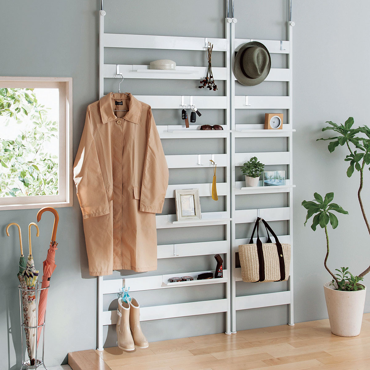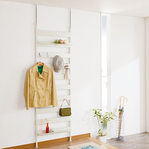 ショップのような壁面収納が楽しめるラダータイプ。おしゃれな5色展開で、インテリアとしての活用度も大。小物収納に便利な棚やフックは、お好みの位置に設置できます。収納したいけどチェストやタンスを置くスペースはないし、部屋が狭くなる…、そんな悩みも突っ張りラダーラックなら解決できます。スペースがなくても天井と床があれば設置OK。