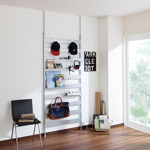 収納したいけどタンスを置いたら部屋が狭くなる…。そんな悩みも突っ張りラダーラックなら解決できます。スペースがなくても天井と床があれば設置OK。付属のフックや棚板はお好みの位置に設置できます。5色のスタイルで選べるラダータイプの壁面収納シリーズ。