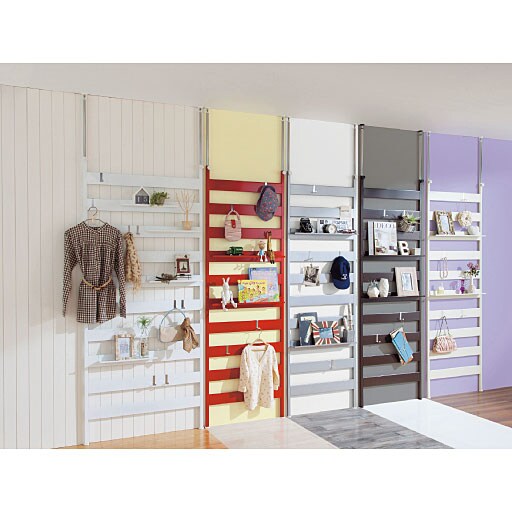 収納したいけどタンスを置いたら部屋が狭くなる…。そんな悩みも突っ張りラダーラックなら解決できます。スペースがなくても天井と床があれば設置OK。付属のフックや棚板はお好みの位置に設置できます。5色のスタイルで選べるラダータイプの壁面収納シリーズ。