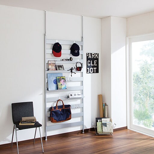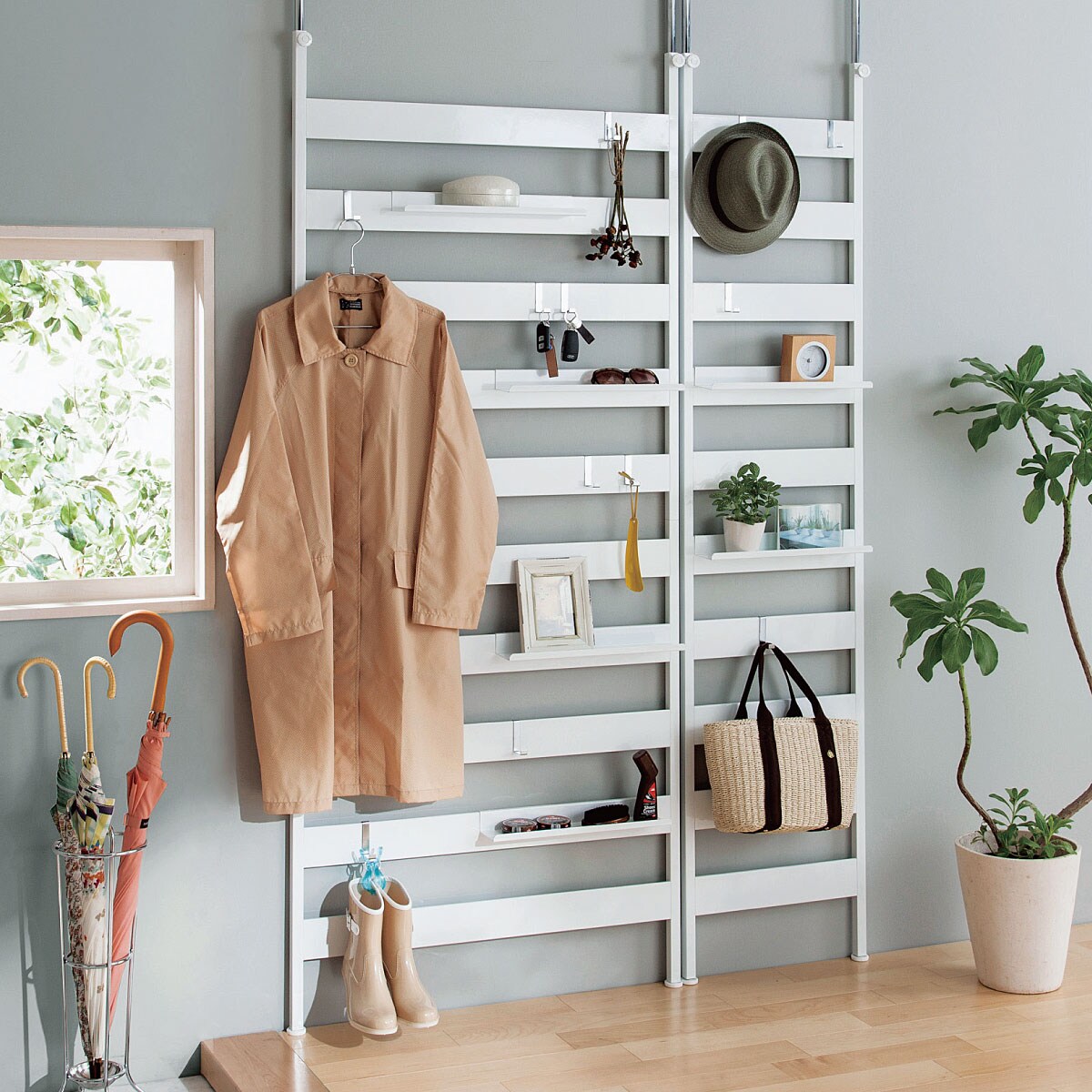 玄関に置けば、コート掛けや、キーフックにも使えます。また、ファブリックパネルなどを棚に飾れば、来客時の印象がガラリとオシャレになります。奥行きが浅いので、スペースをとらない収納アイテムです。