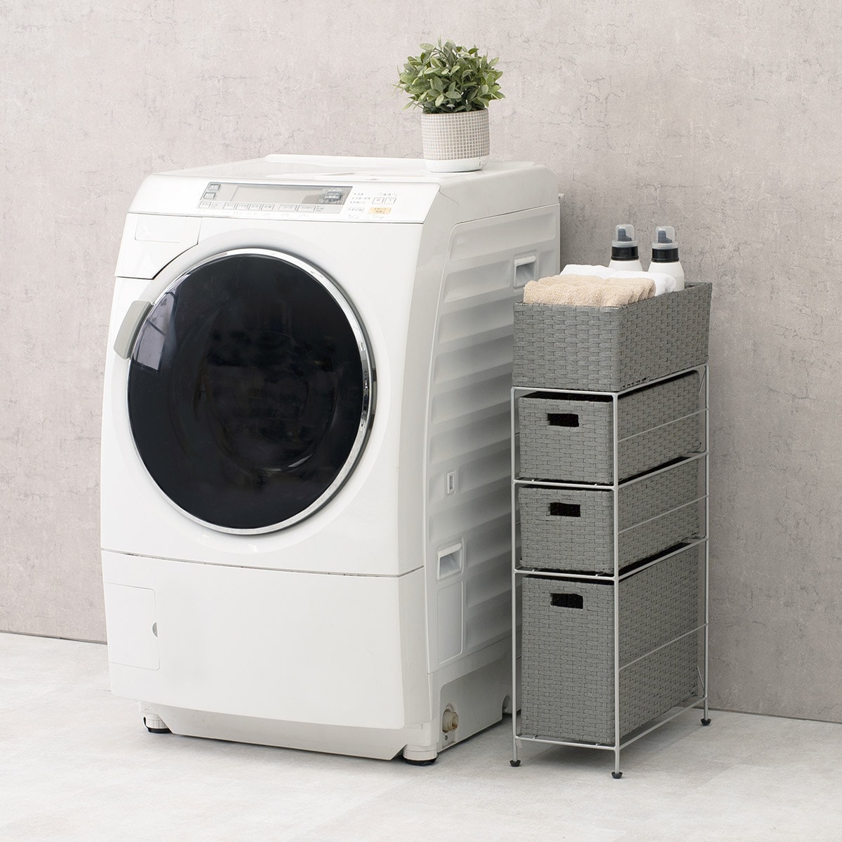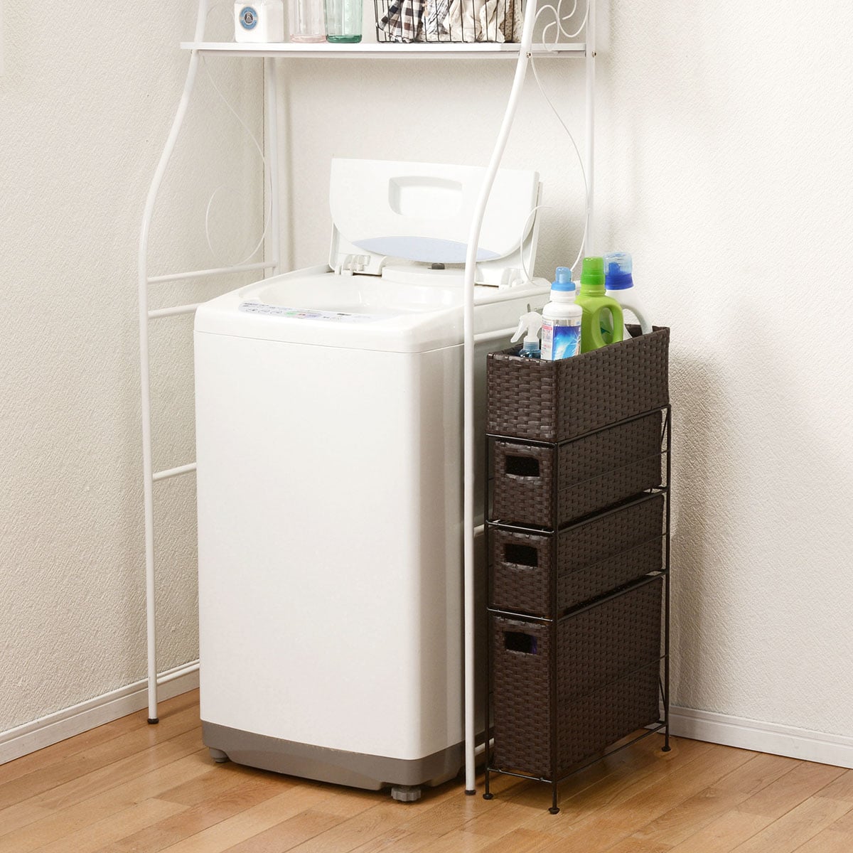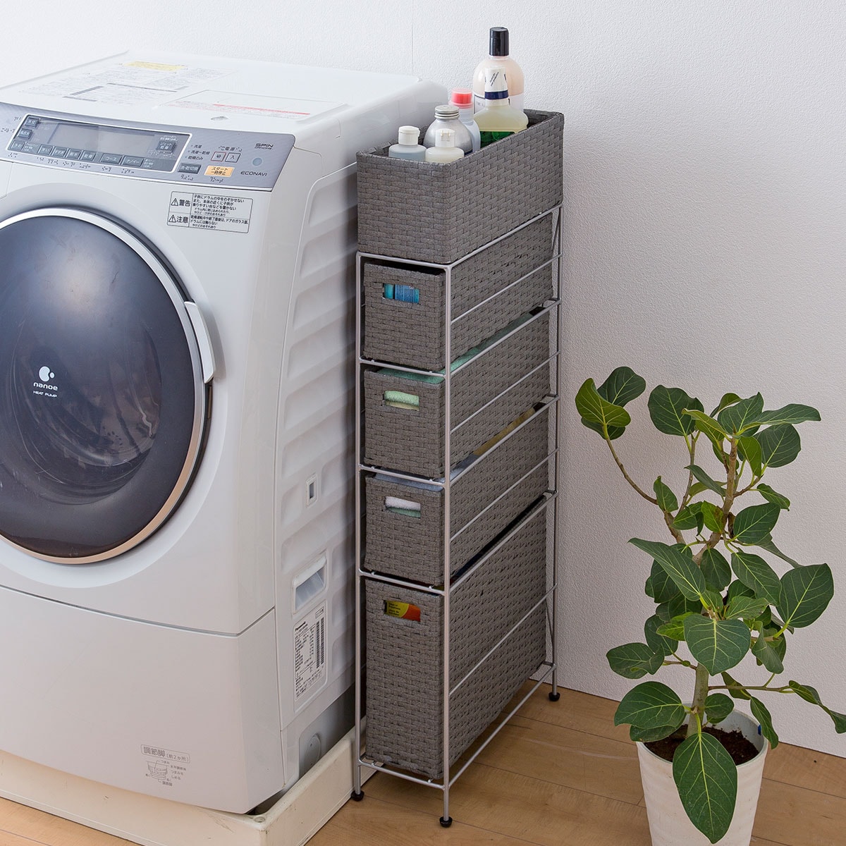 最上段は物が落ちにくいバスケット形状。毎日使うドライヤーや洗剤などがさっと取り出せます。