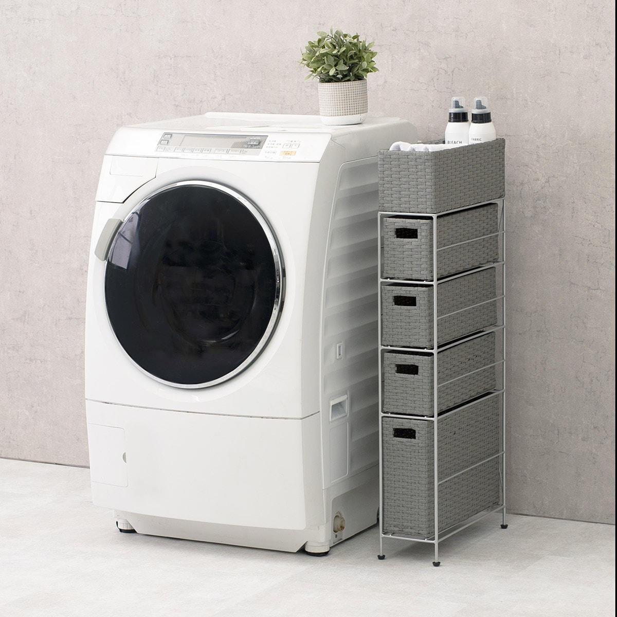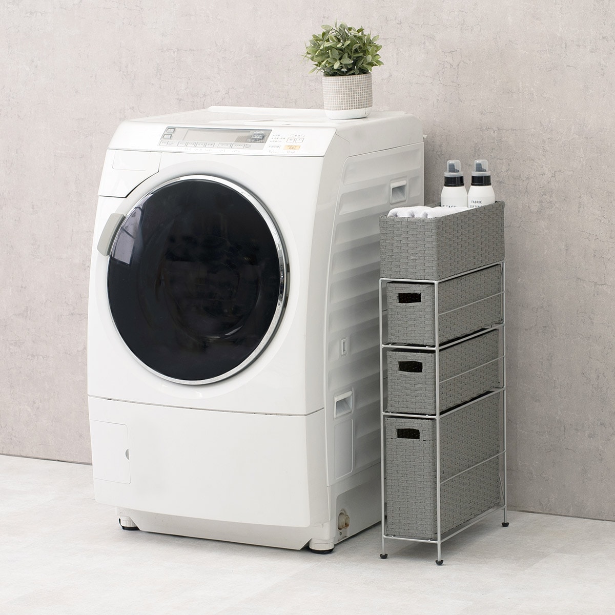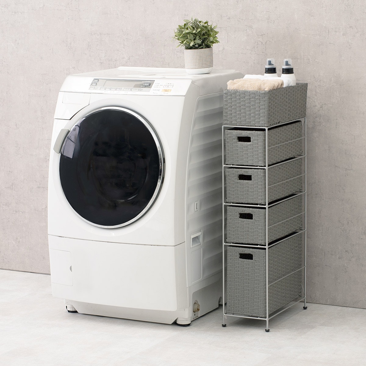最上段は物が落ちにくいバスケット形状。毎日使うドライヤーや洗剤などがさっと取り出せます。